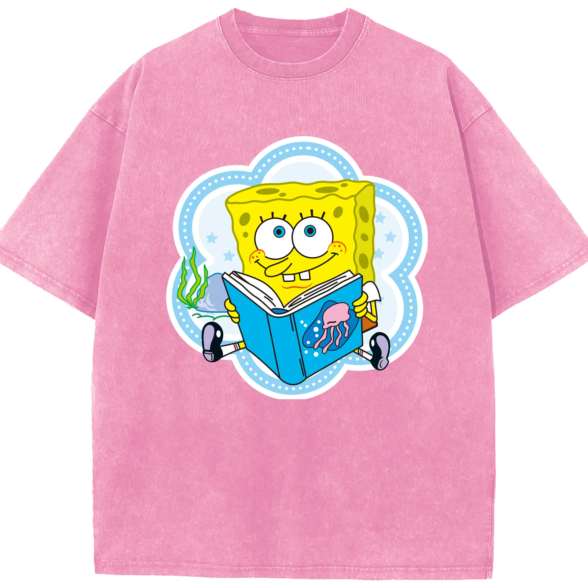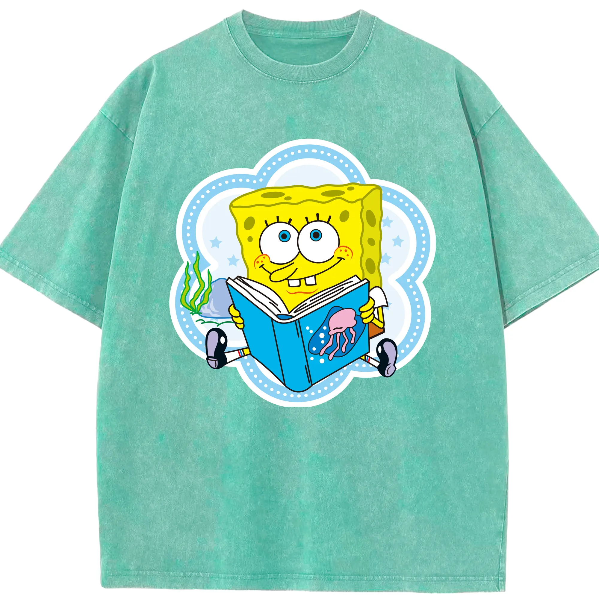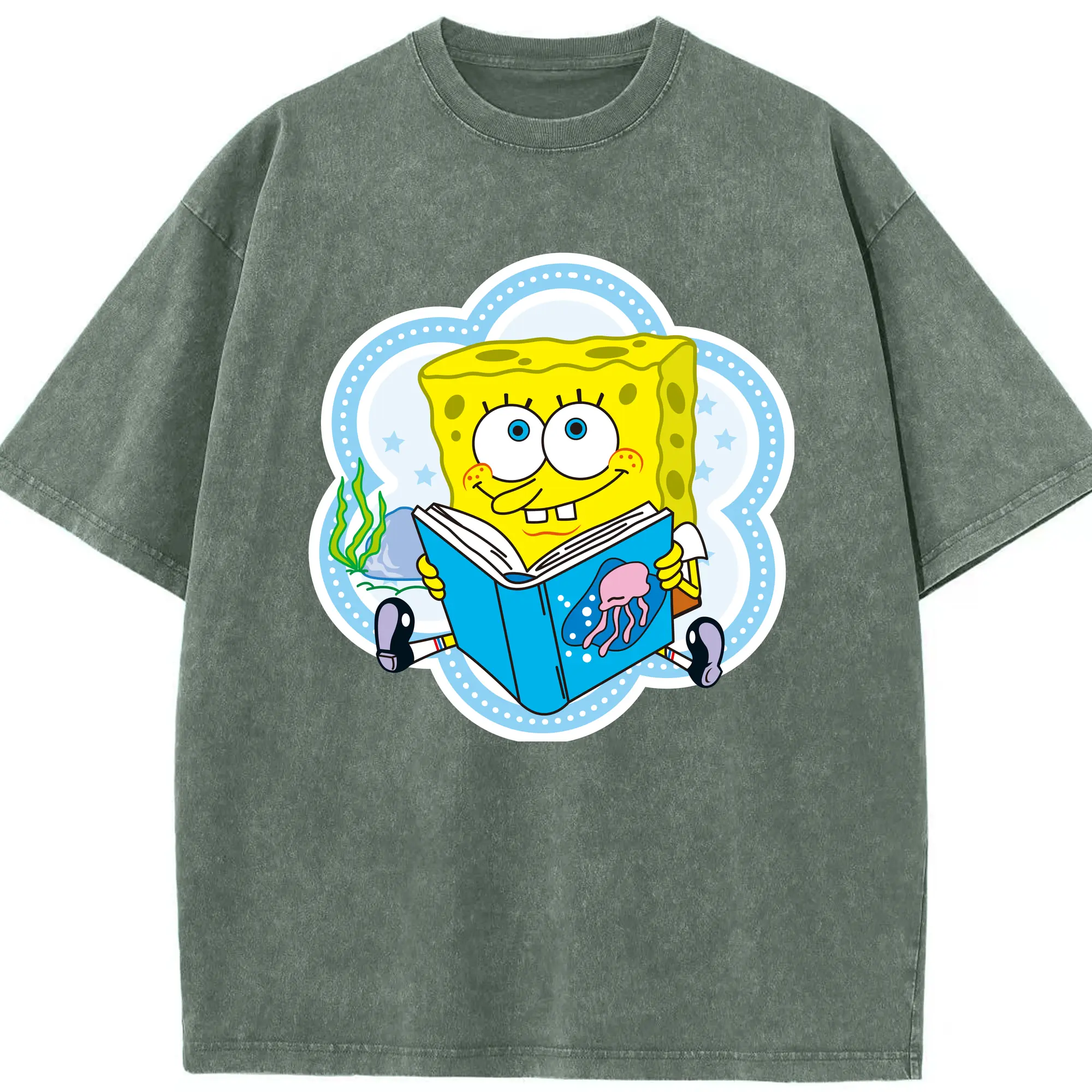 Spongebob squarepants reading book graphic t-shirt - Washed Vintage Look 230g Cotton Oversized T-Shirt With Front Heat Transfer Print – Soft, Lightweight, Stylish Fit – Comfortable Casual Wear For Sports & Everyday Use