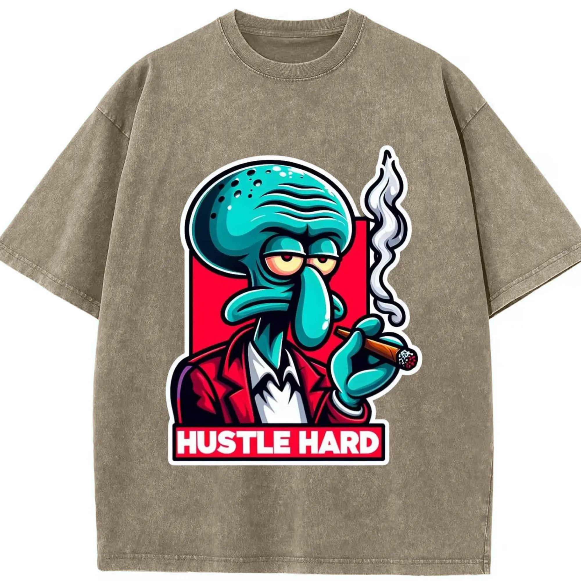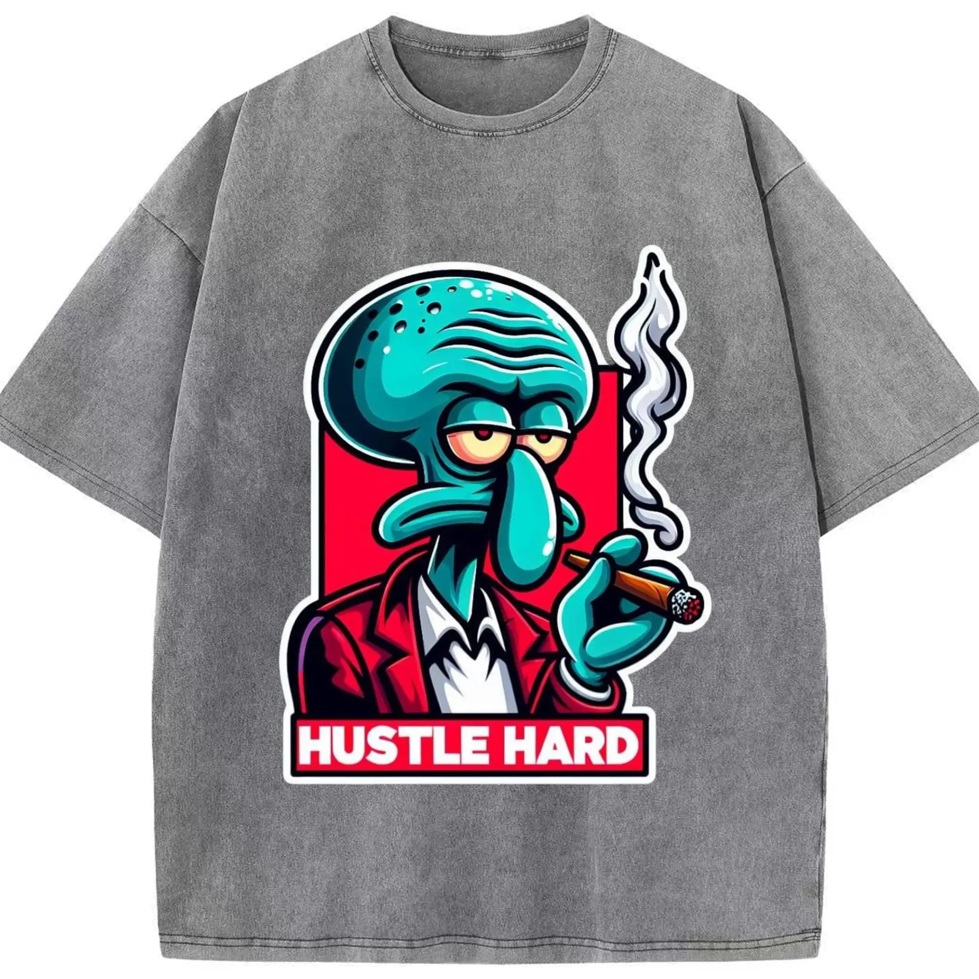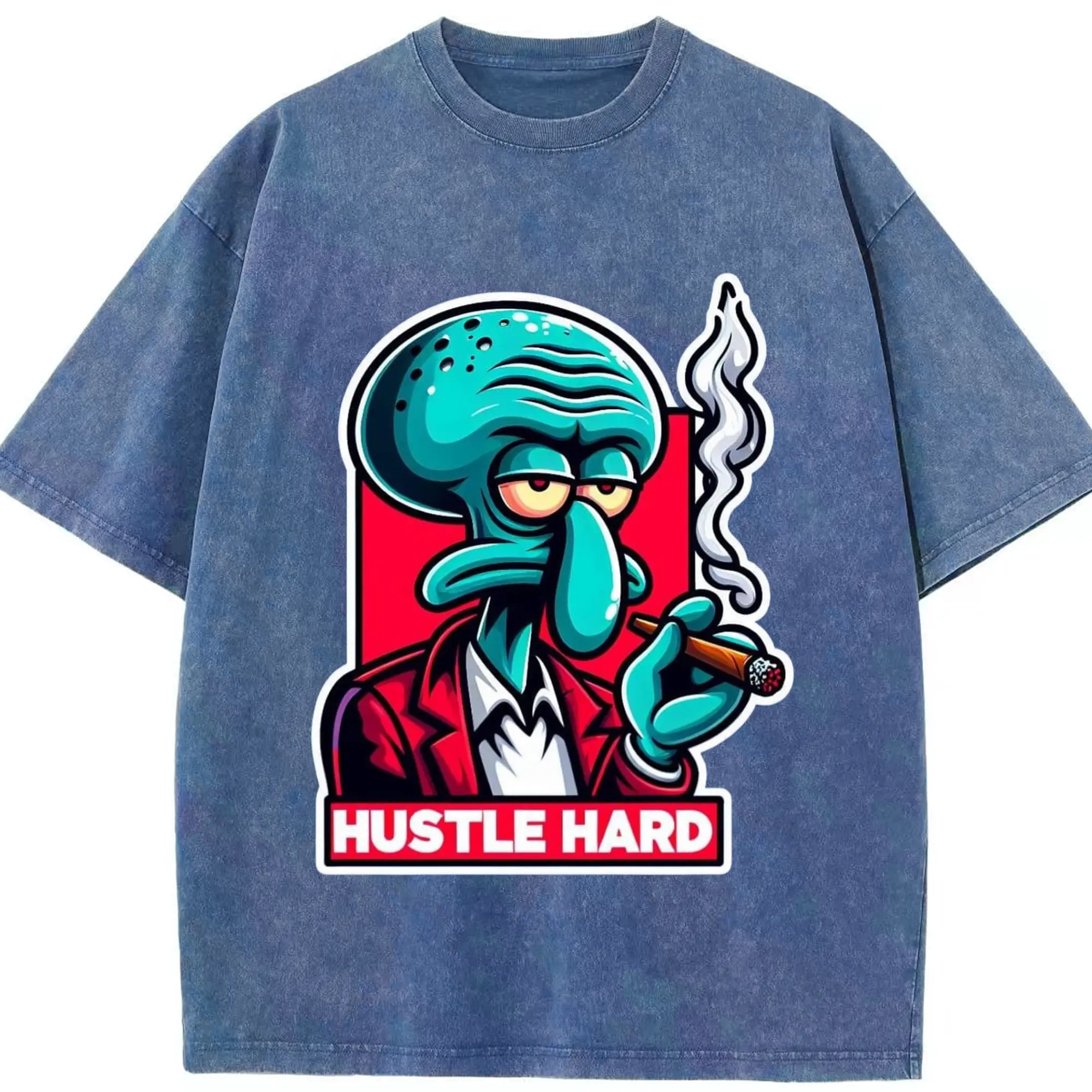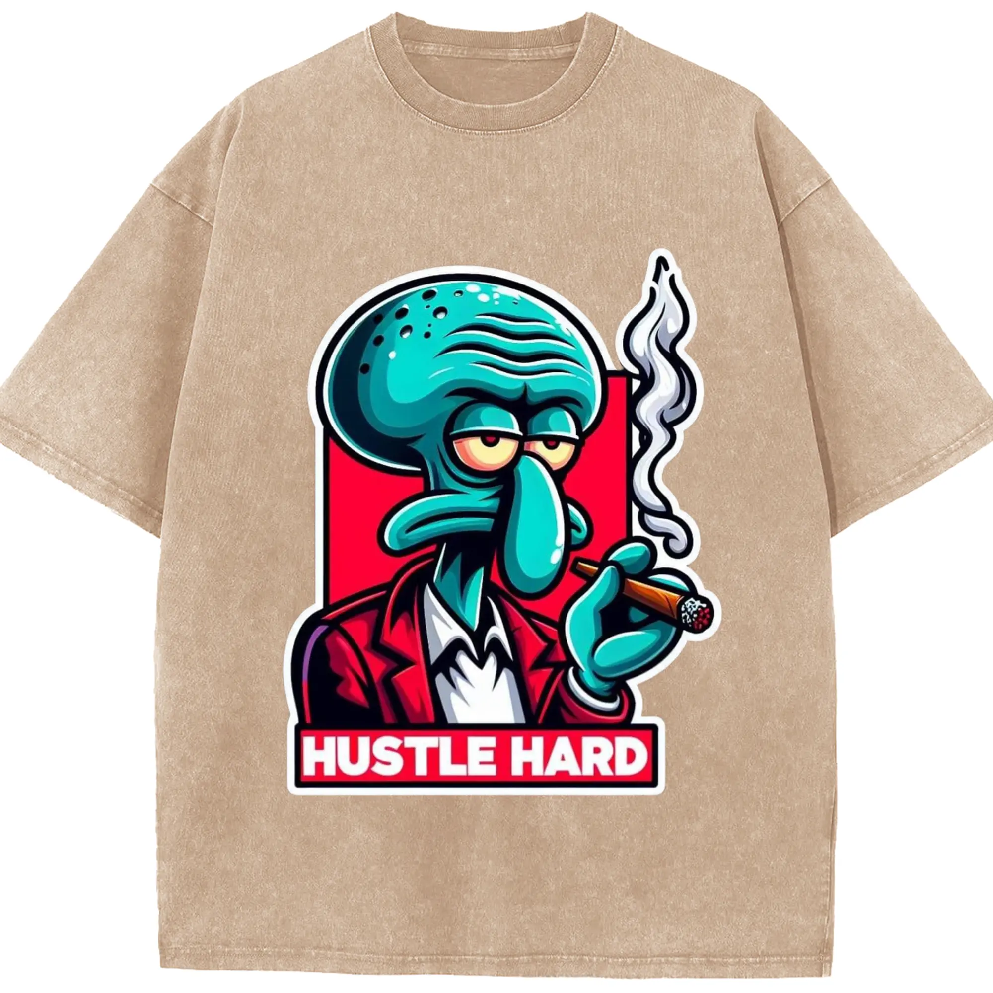 Spongebob Squidward hustle hard t-shirt - Washed Vintage Look 230g Cotton Oversized T-Shirt With Front Heat Transfer Print – Soft, Lightweight, Stylish Fit – Comfortable Casual Wear For Sports & Everyday Use