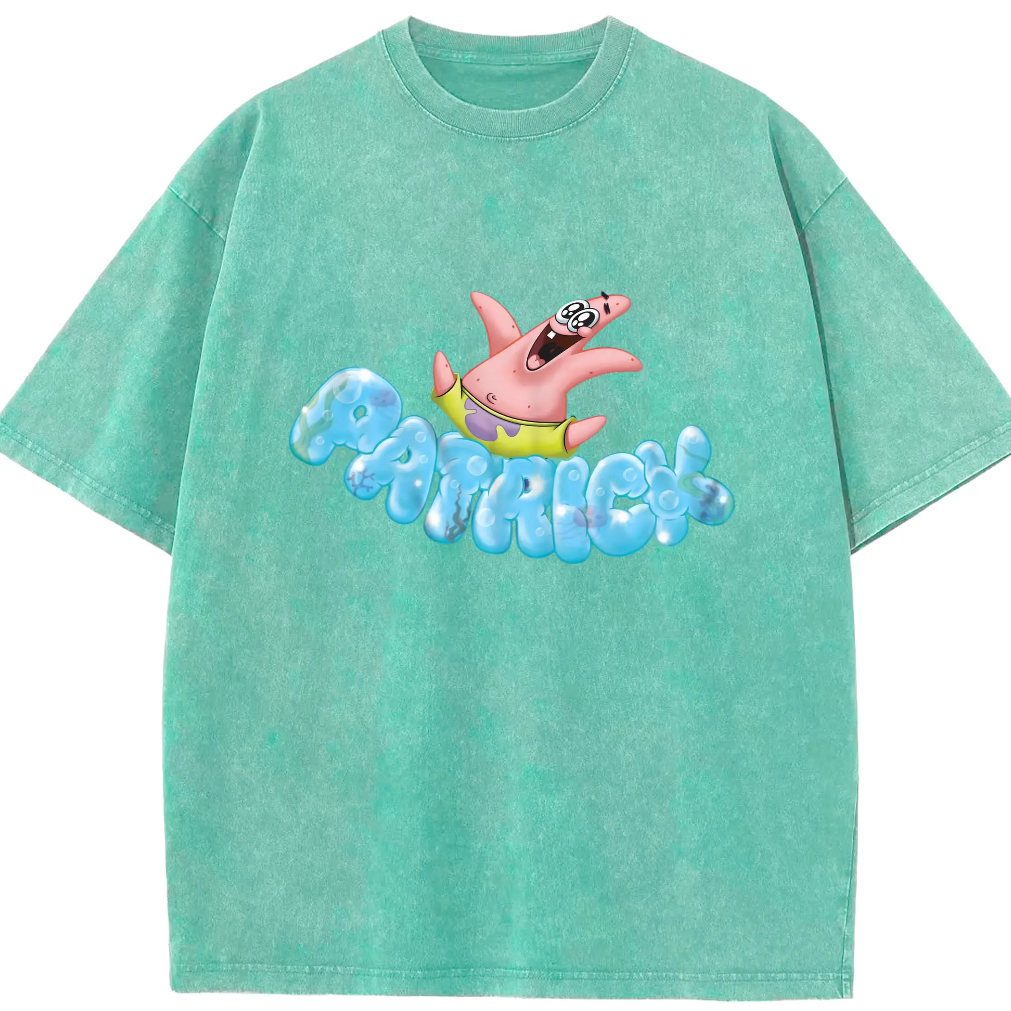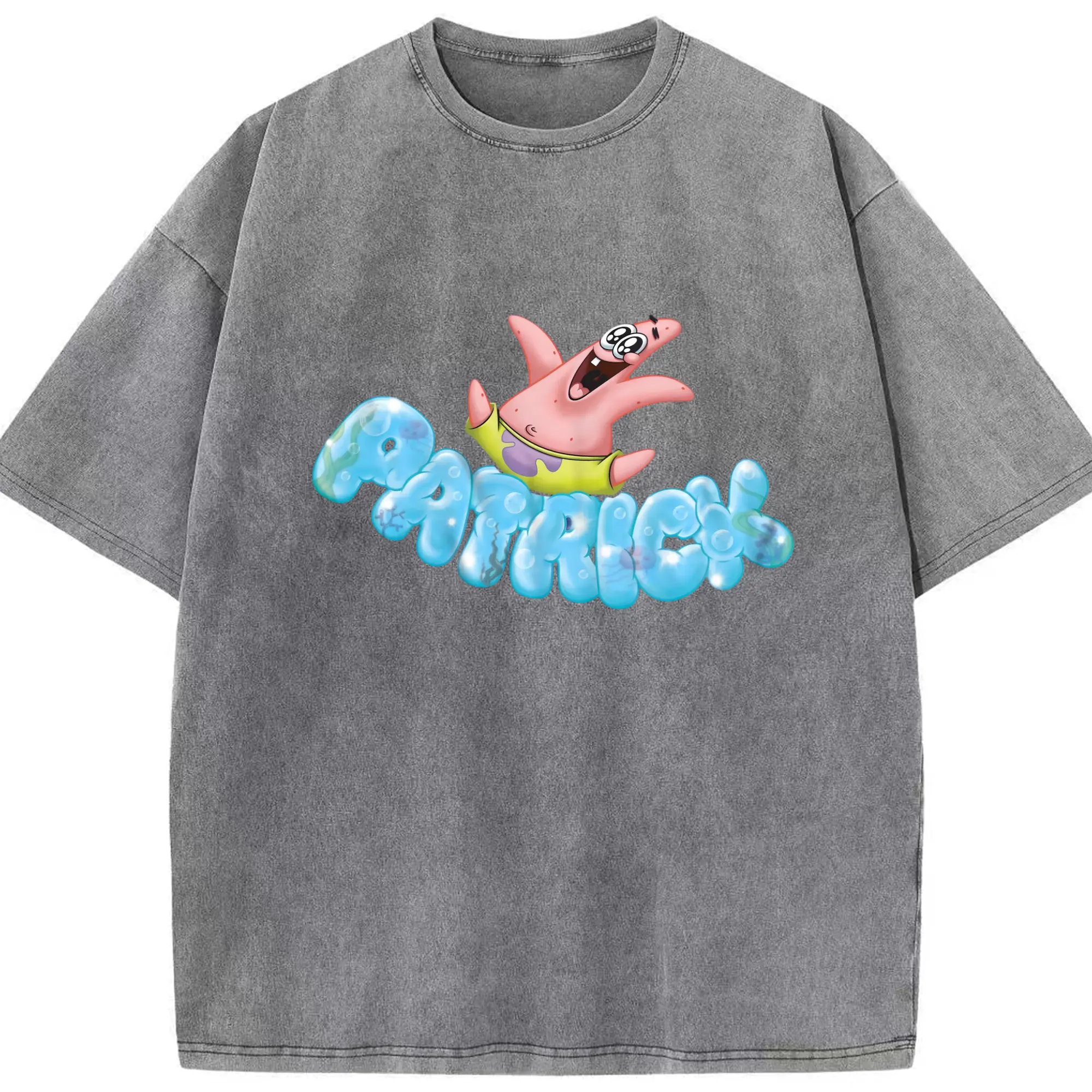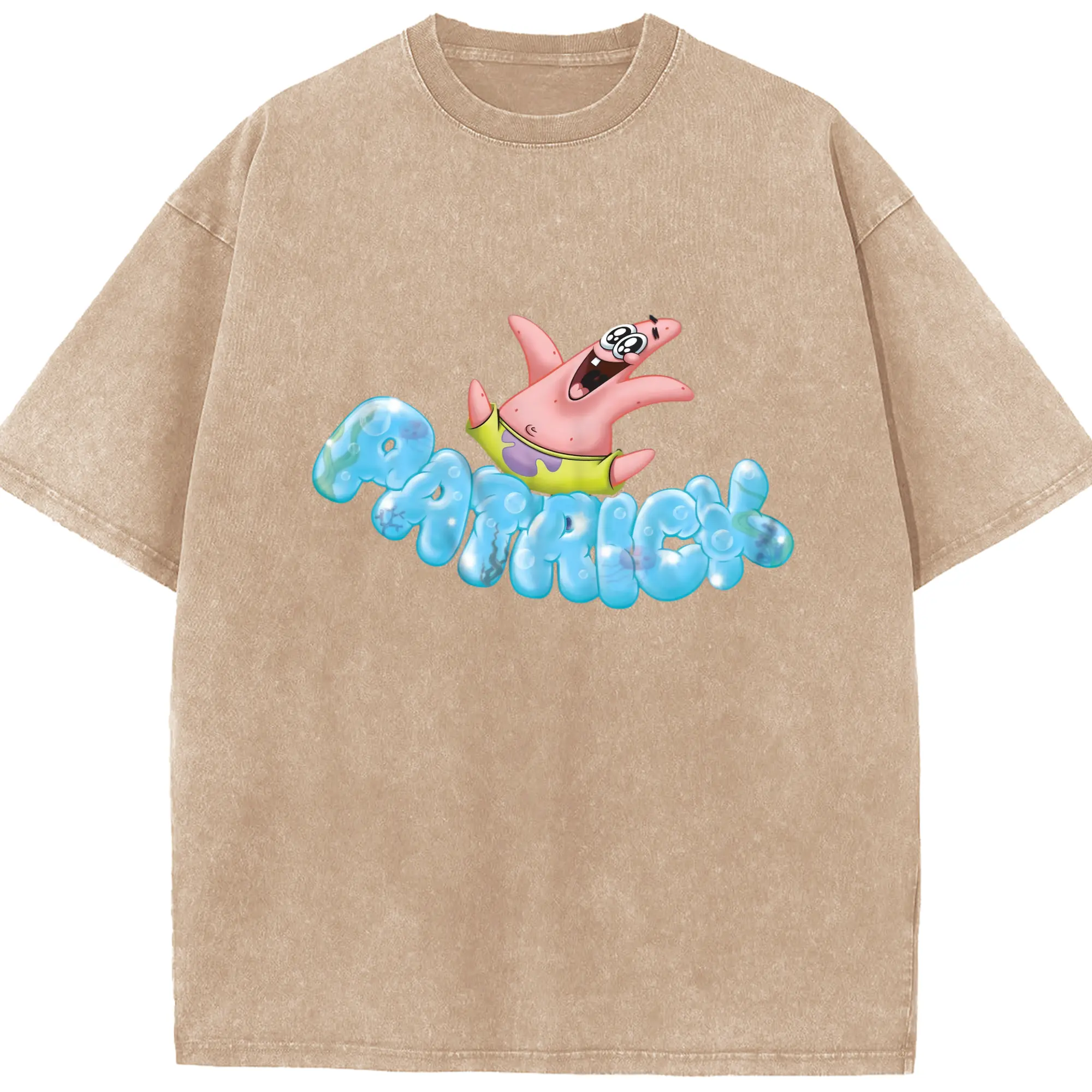 Spongebob super Patrick happy Graphic Tee - Washed Vintage Look 230g Cotton Oversized T-Shirt With Front Heat Transfer Print – Soft, Lightweight, Stylish Fit – Comfortable Casual Wear For Sports & Everyday Use