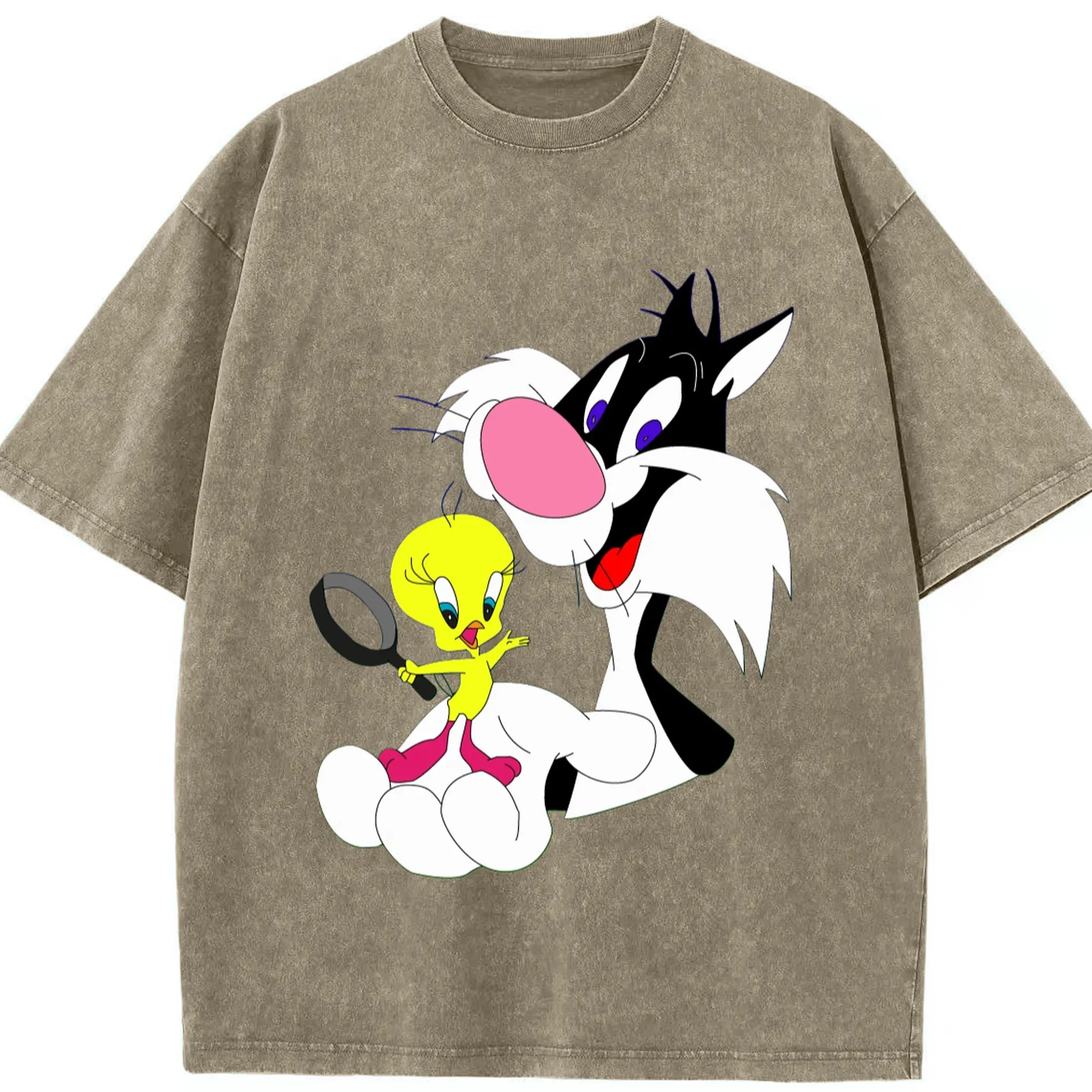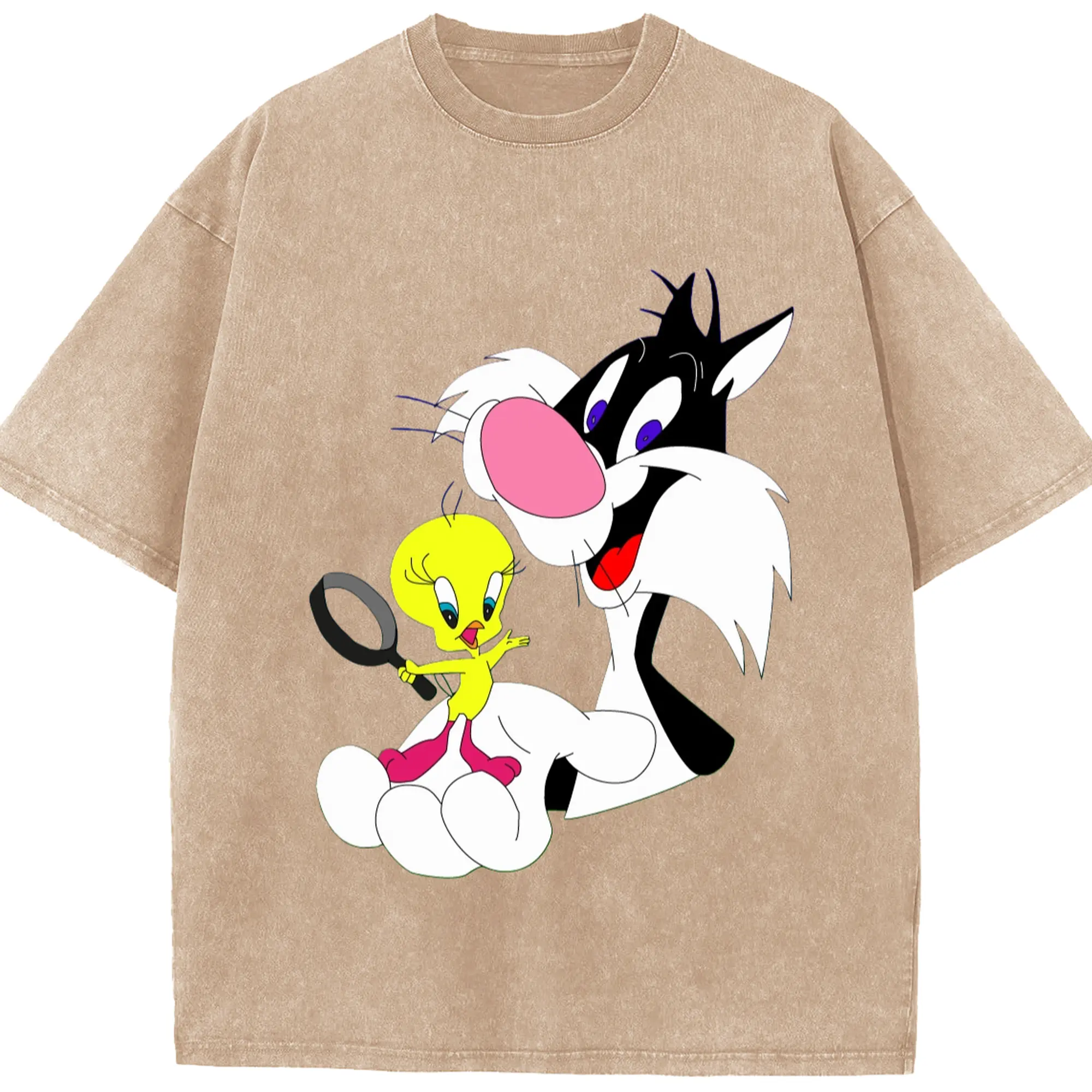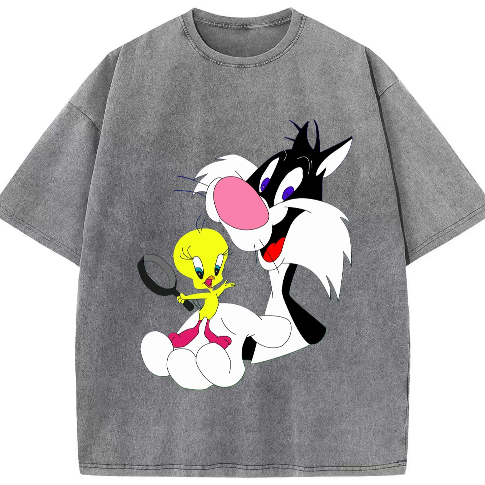 Sylvester and tweety t shirt​ - Washed Vintage Look 230g Cotton Oversized T-Shirt With Front Heat Transfer Print – Soft, Lightweight, Stylish Fit – Comfortable Casual Wear For Sports & Everyday Use