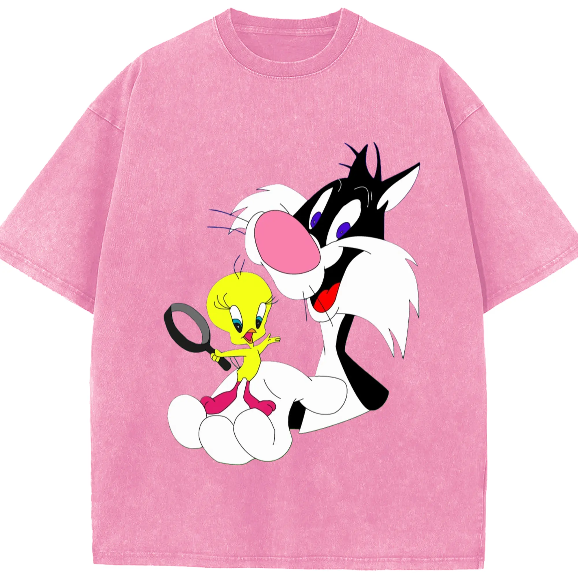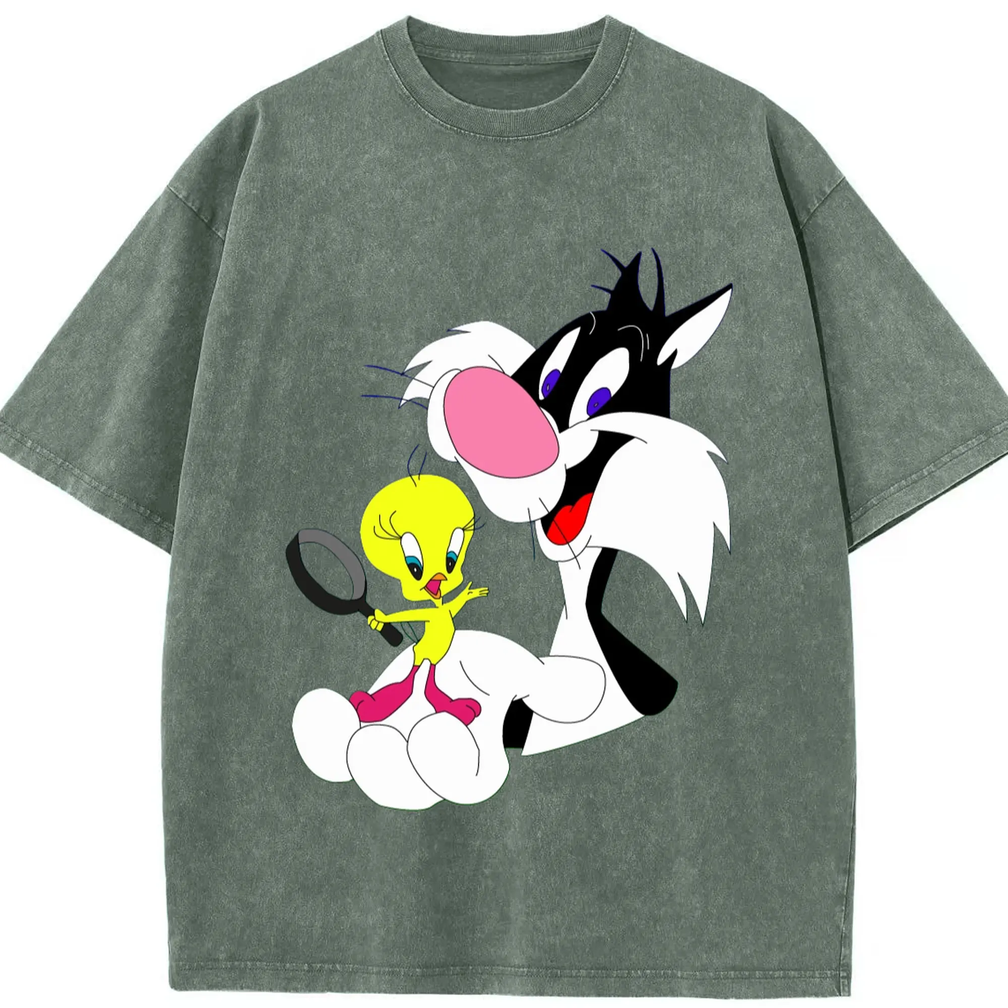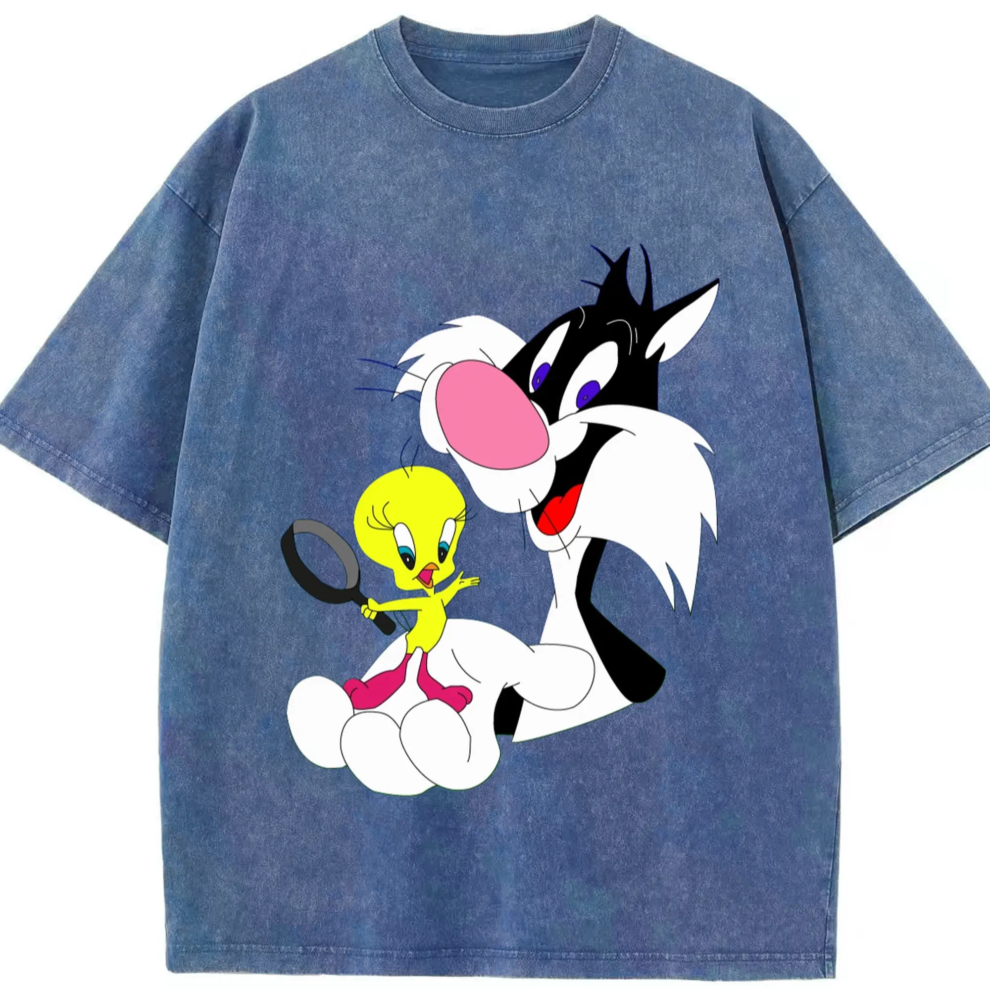 Sylvester and tweety t shirt​ - Washed Vintage Look 230g Cotton Oversized T-Shirt With Front Heat Transfer Print – Soft, Lightweight, Stylish Fit – Comfortable Casual Wear For Sports & Everyday Use