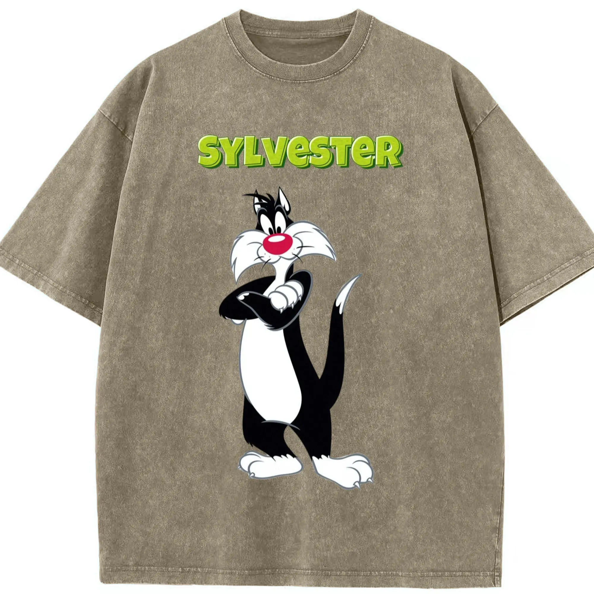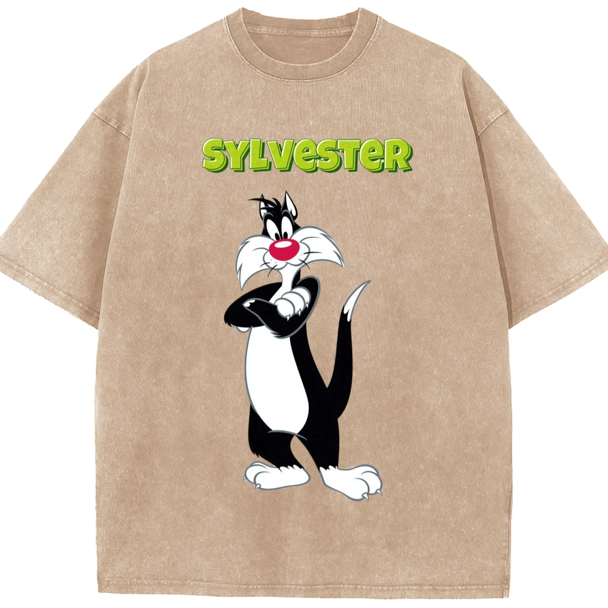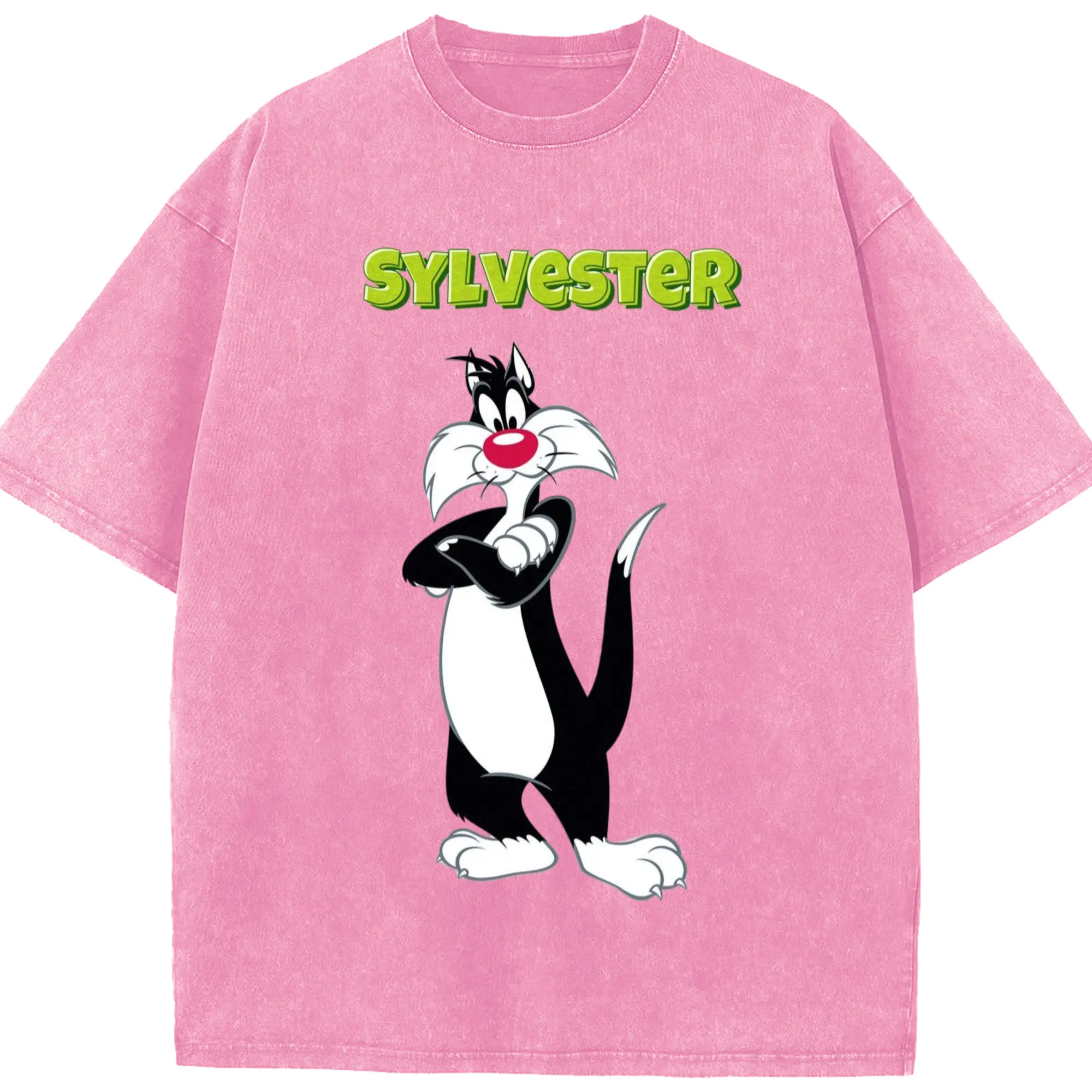 Sylvester The Cat T Shirt - Washed Vintage Look 230g Cotton Oversized T-Shirt With Front Heat Transfer Print – Soft, Lightweight, Stylish Fit – Comfortable Casual Wear For Sports & Everyday Use