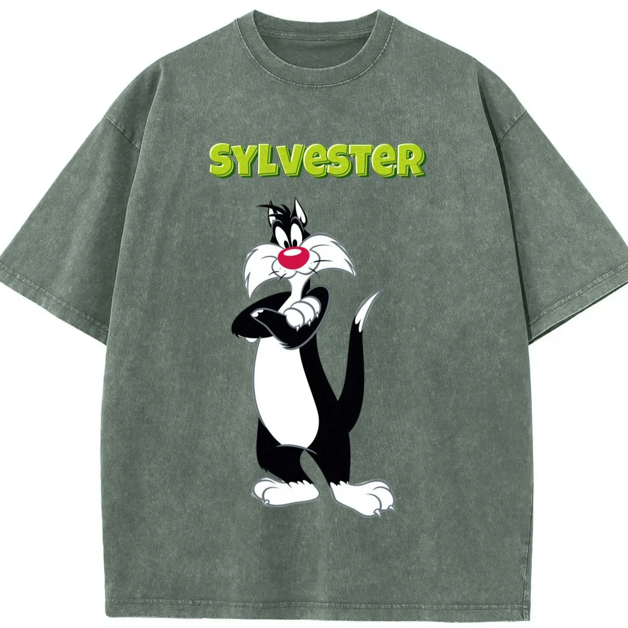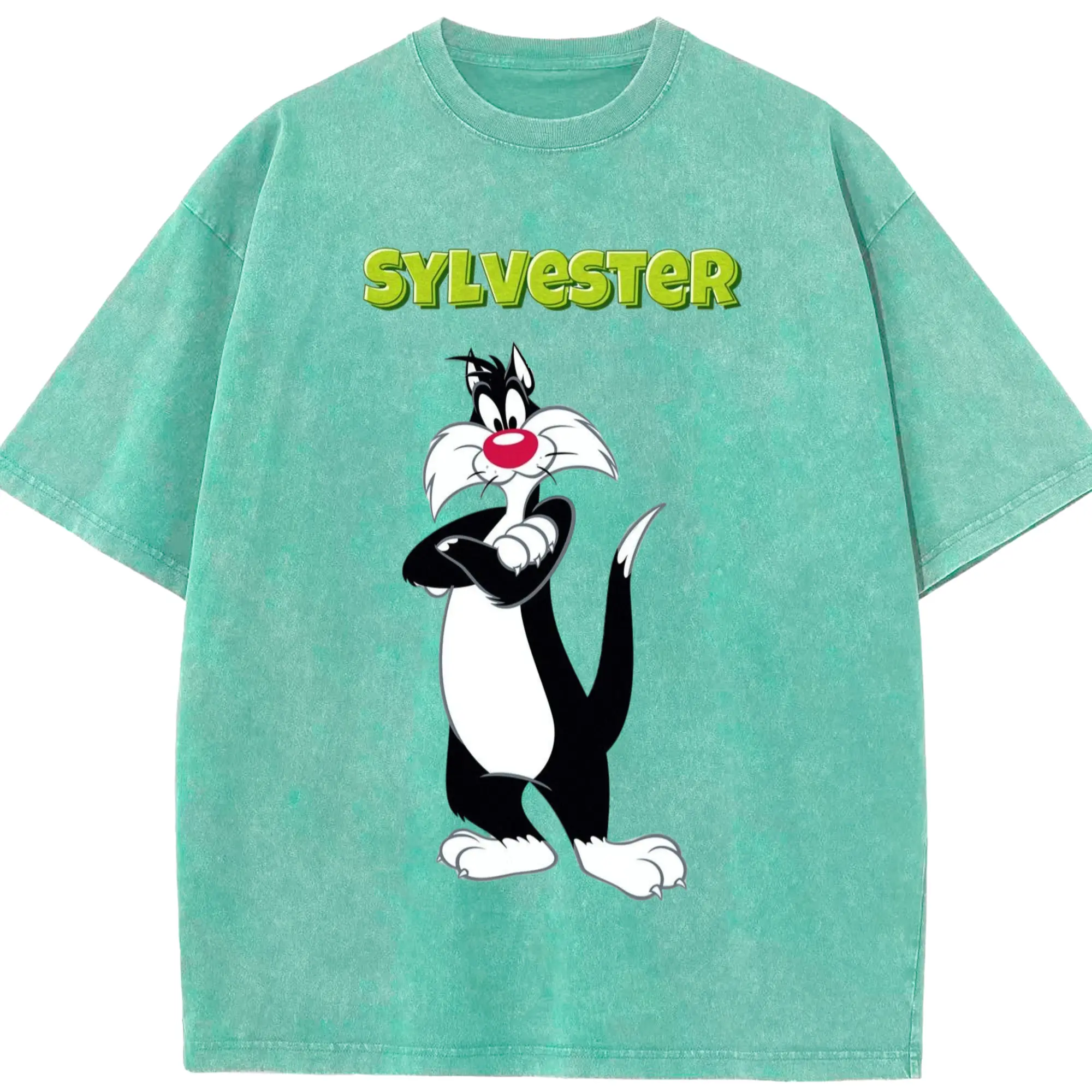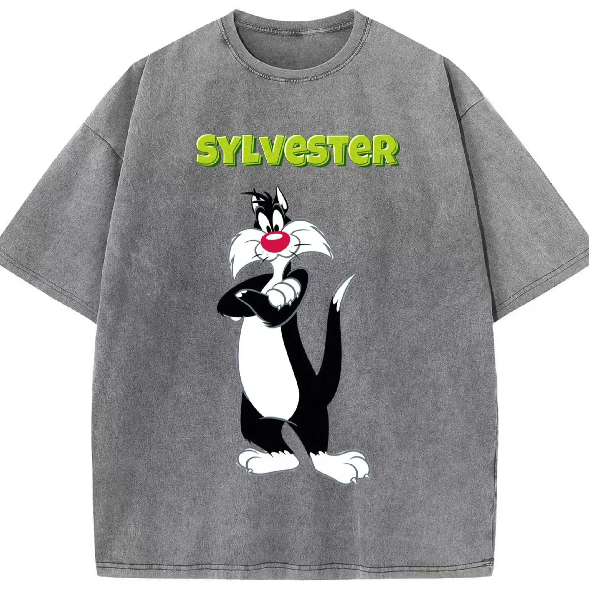 Sylvester The Cat T Shirt - Washed Vintage Look 230g Cotton Oversized T-Shirt With Front Heat Transfer Print – Soft, Lightweight, Stylish Fit – Comfortable Casual Wear For Sports & Everyday Use
