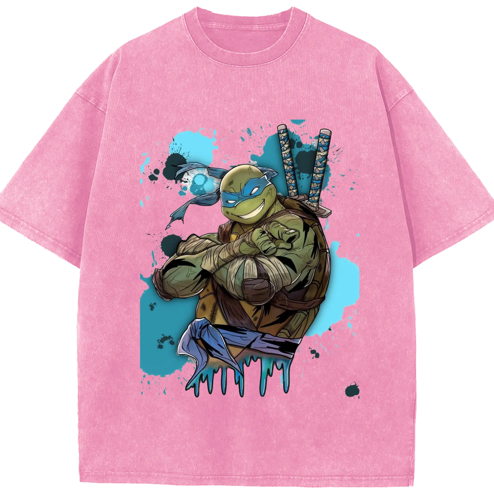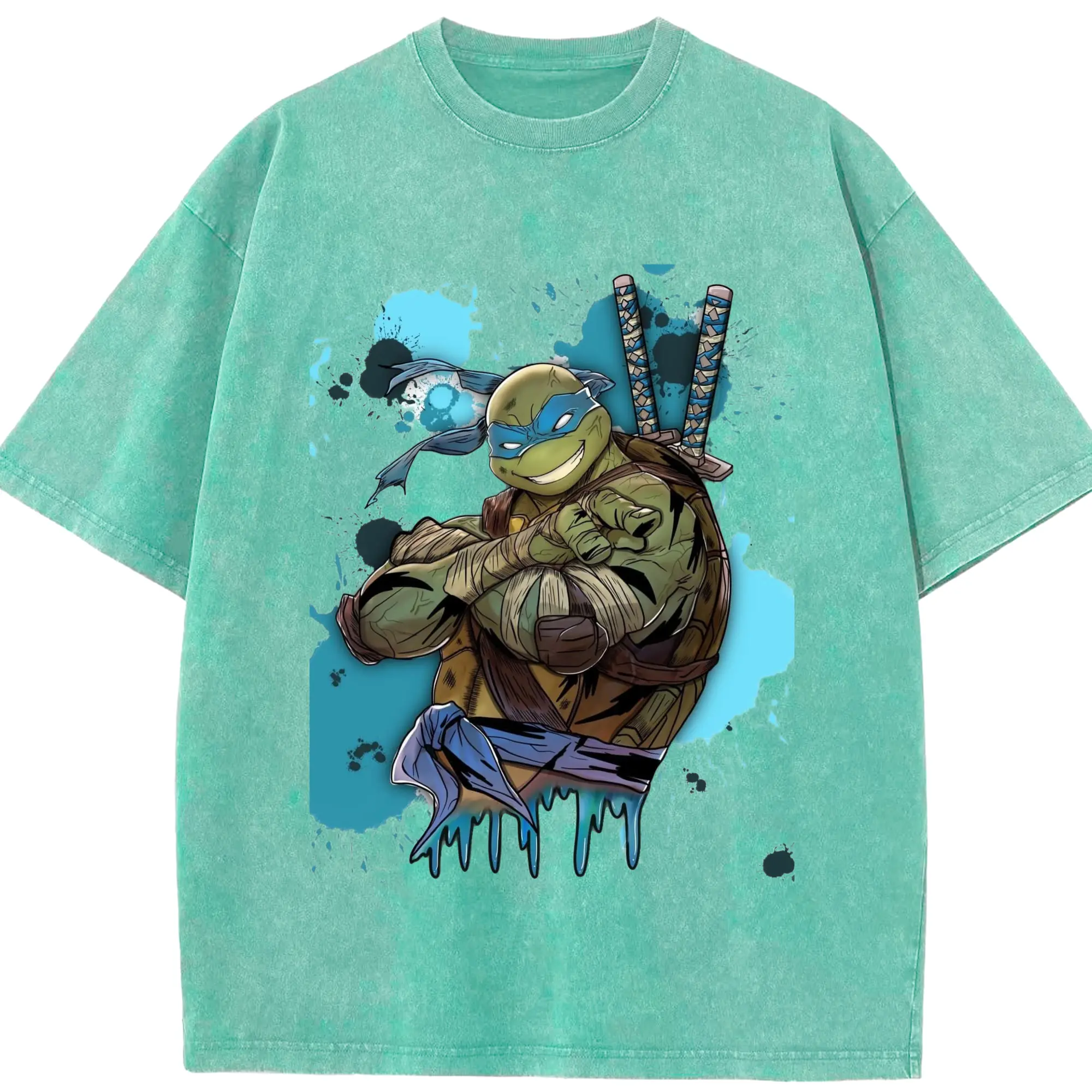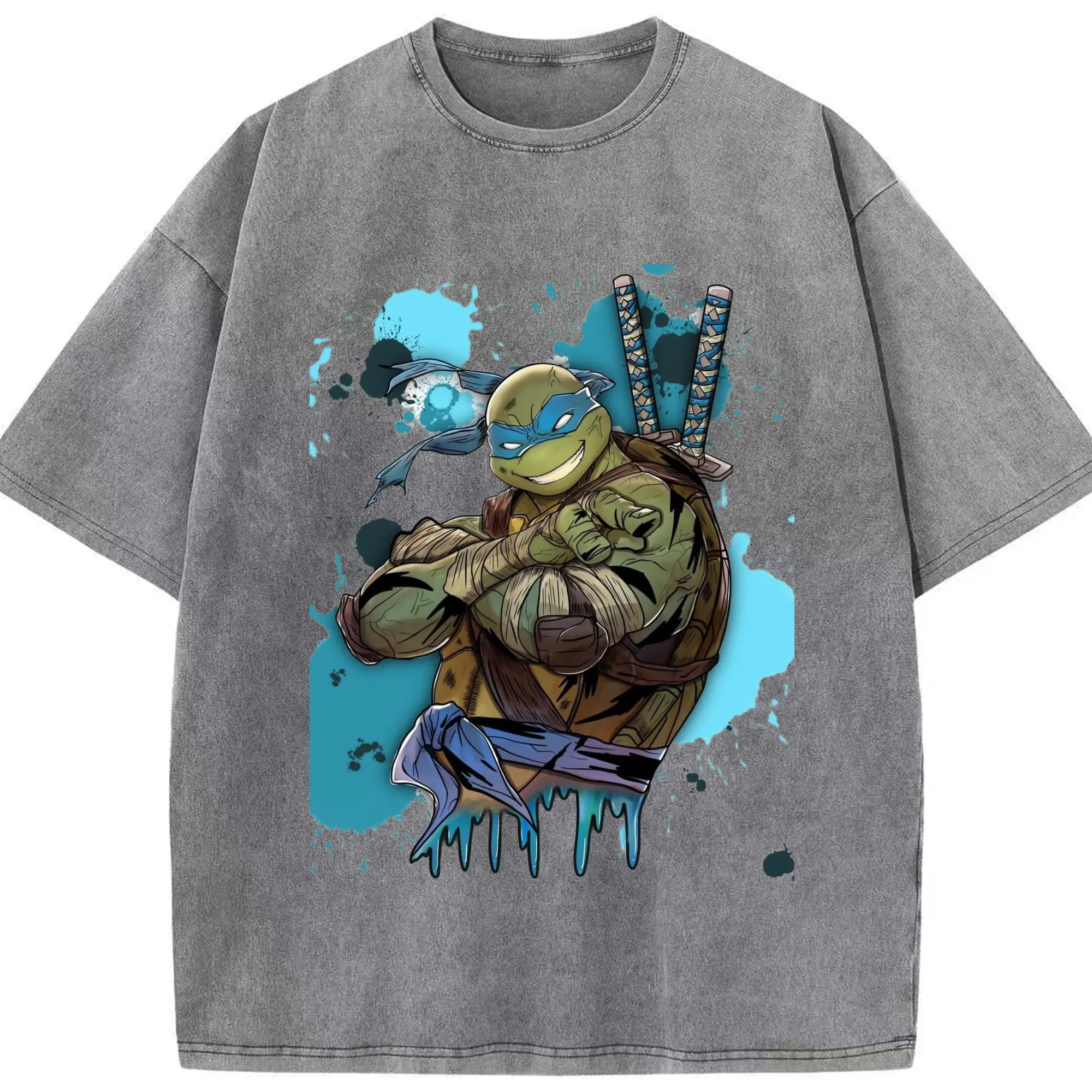 Teenage Mutant Ninja Turtles Leonardo T-Shirt - Washed Vintage Look 230g Cotton Oversized T-Shirt With Front Heat Transfer Print – Soft, Lightweight, Stylish Fit – Comfortable Casual Wear For Sports & Everyday Use