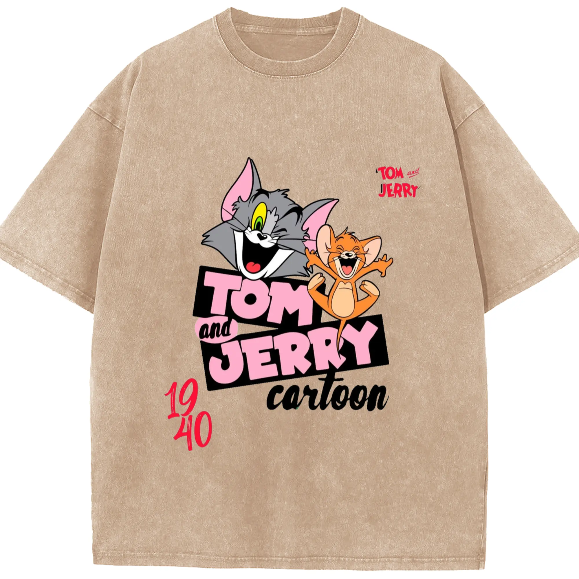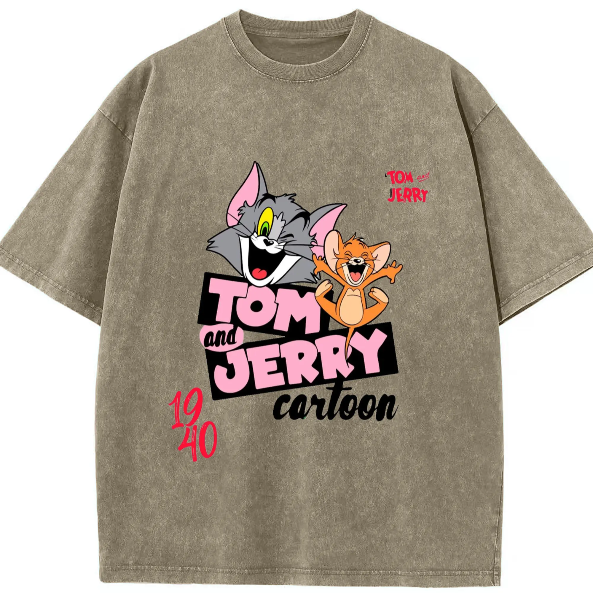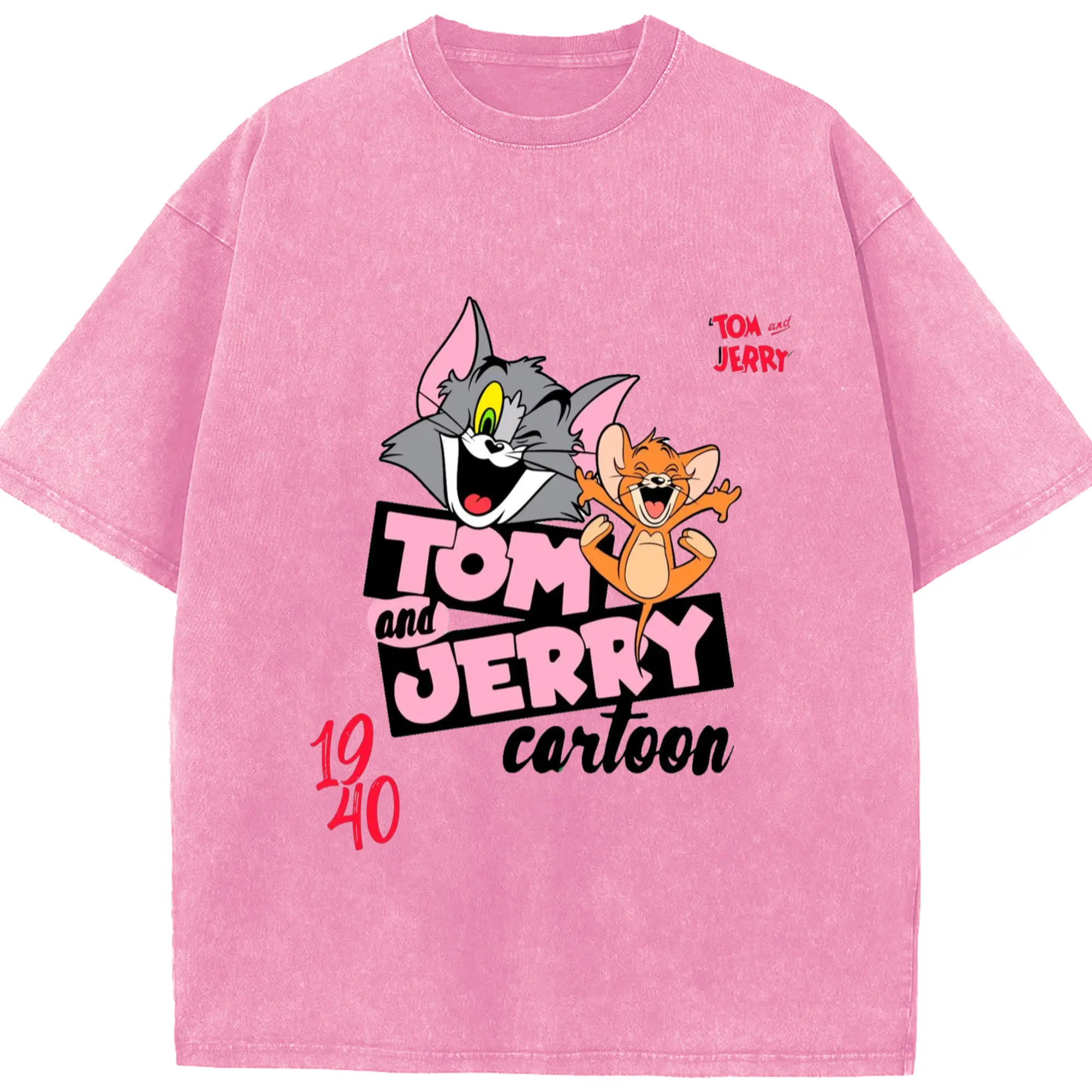 Tom and jerry couple t shirt - Washed Vintage Look 230g Cotton Oversized T-Shirt With Front Heat Transfer Print – Soft, Lightweight, Stylish Fit – Comfortable Casual Wear For Sports & Everyday Use