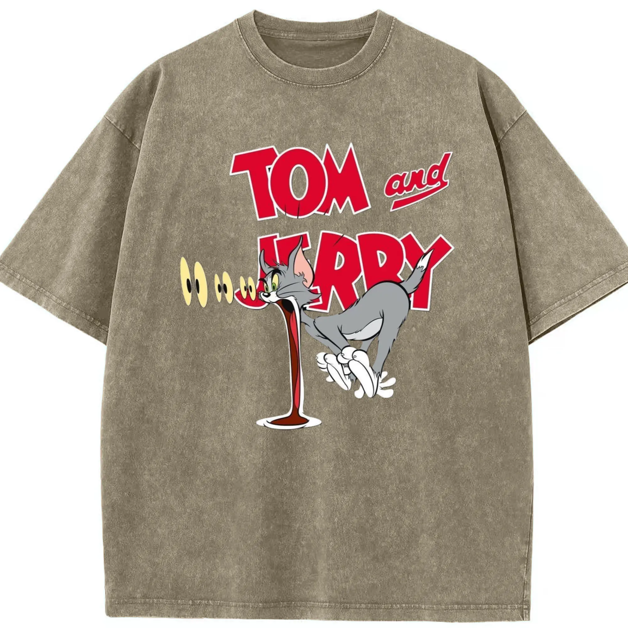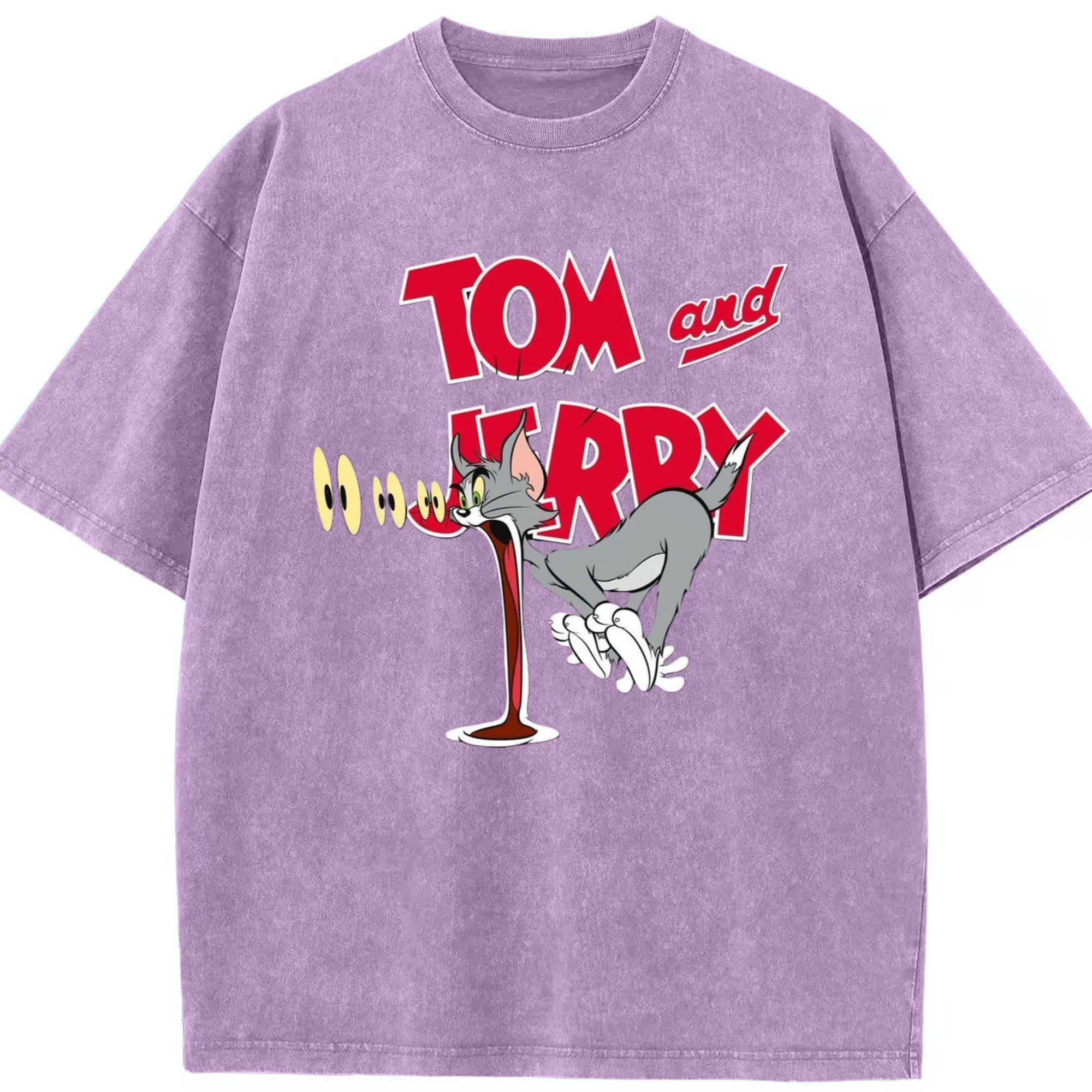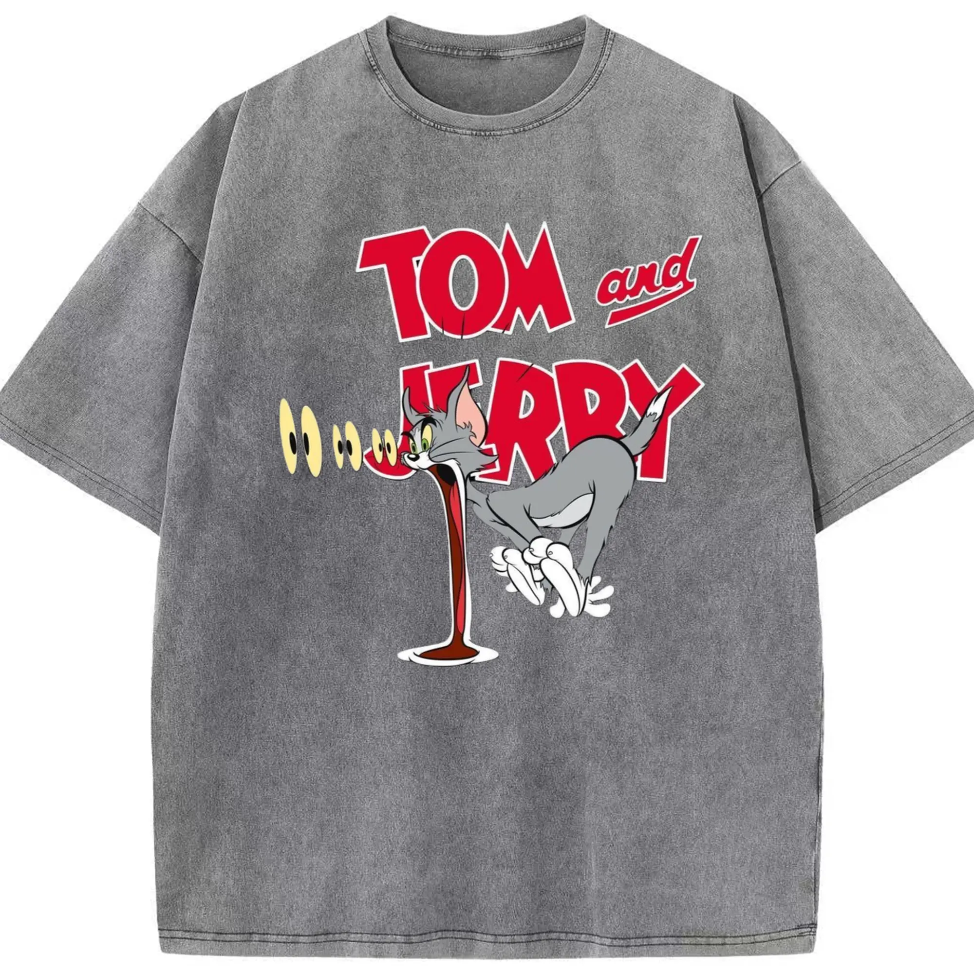Tom and jerry, tom graphic t shirt - Washed Vintage Look 230g Cotton Oversized T-Shirt With Front Heat Transfer Print – Soft, Lightweight, Stylish Fit – Comfortable Casual Wear For Sports & Everyday Use
