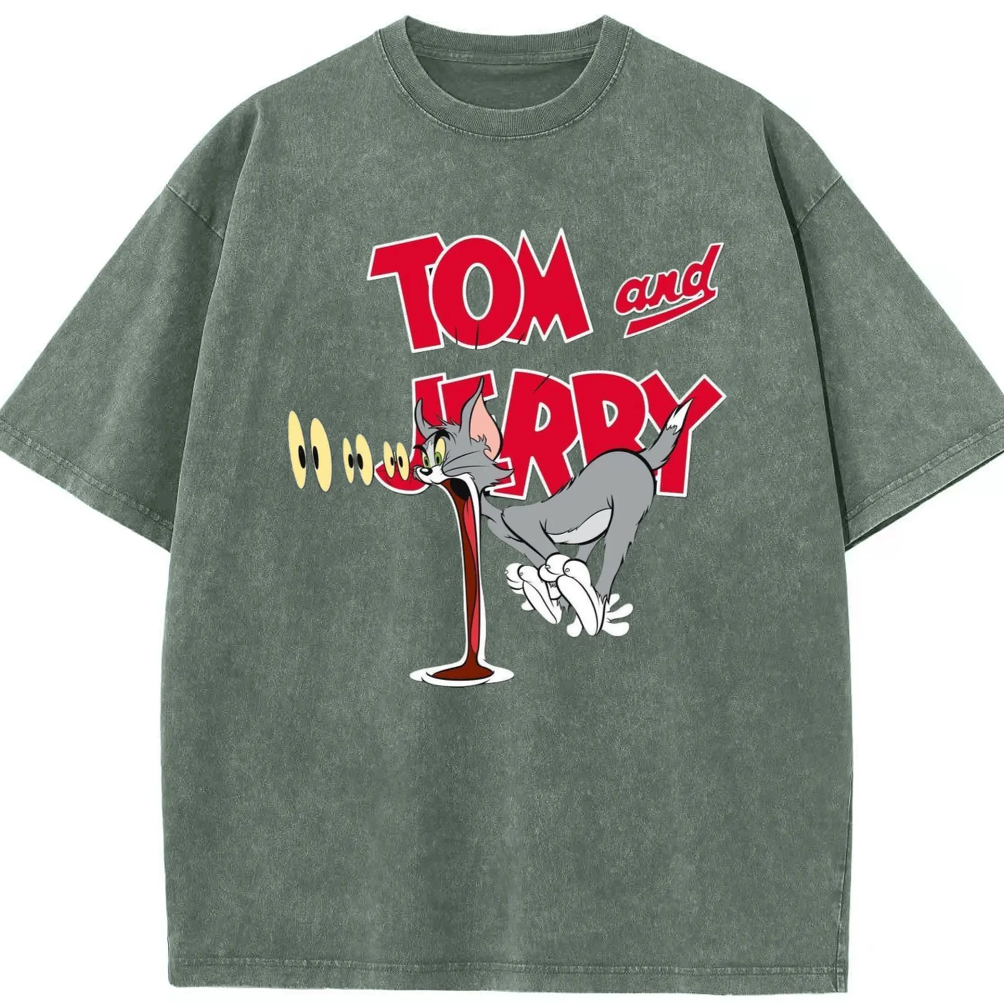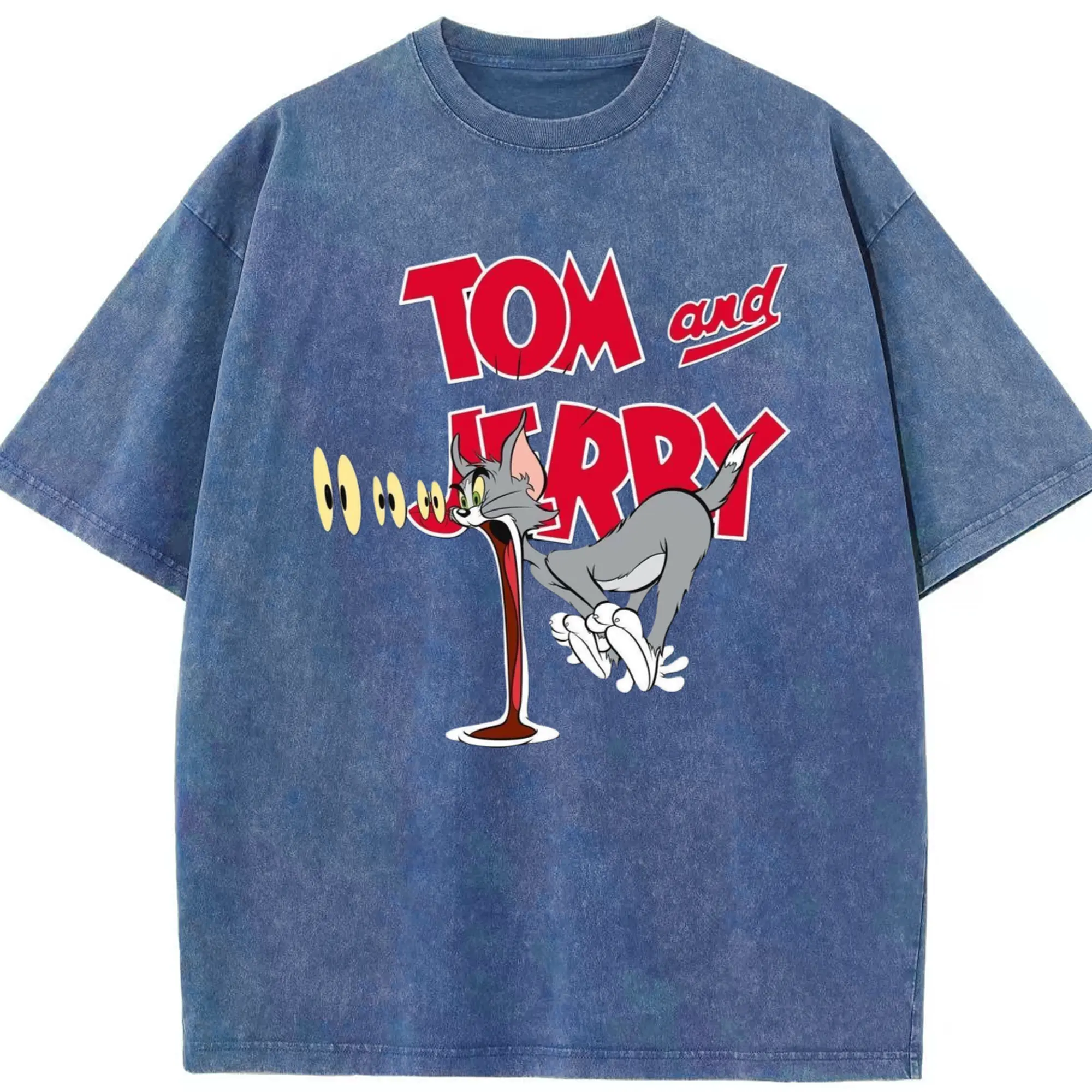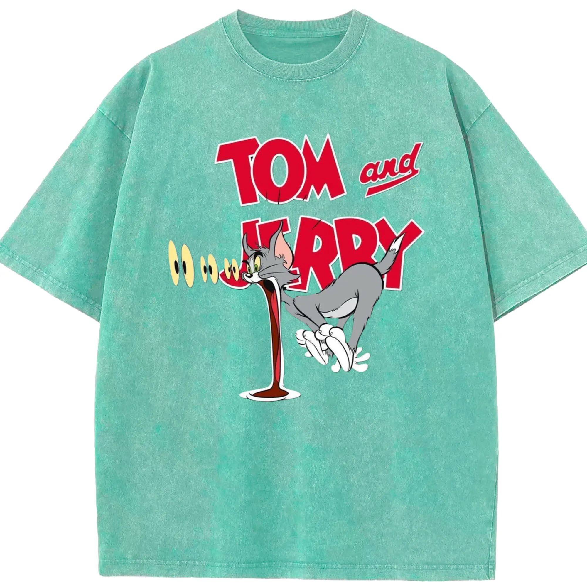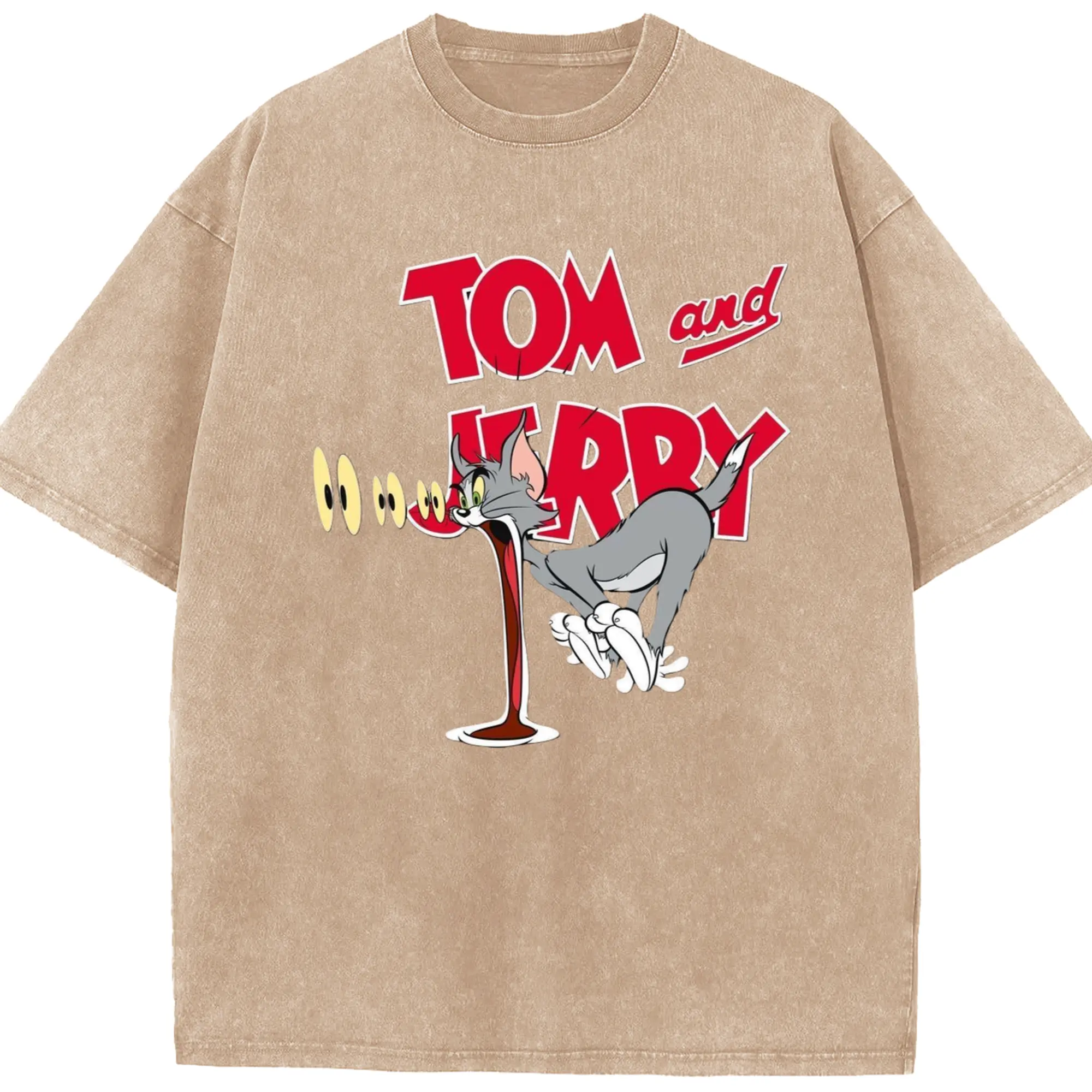 Tom and jerry, tom graphic t shirt - Washed Vintage Look 230g Cotton Oversized T-Shirt With Front Heat Transfer Print – Soft, Lightweight, Stylish Fit – Comfortable Casual Wear For Sports & Everyday Use