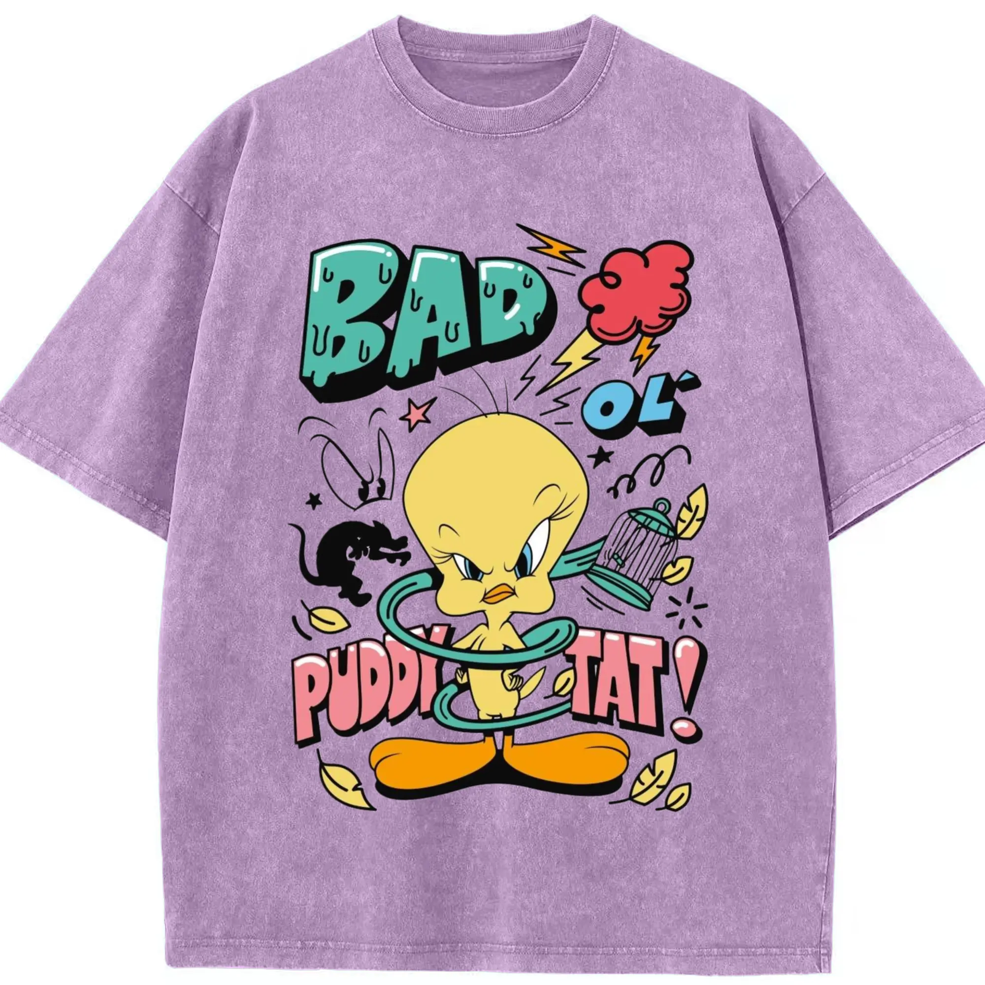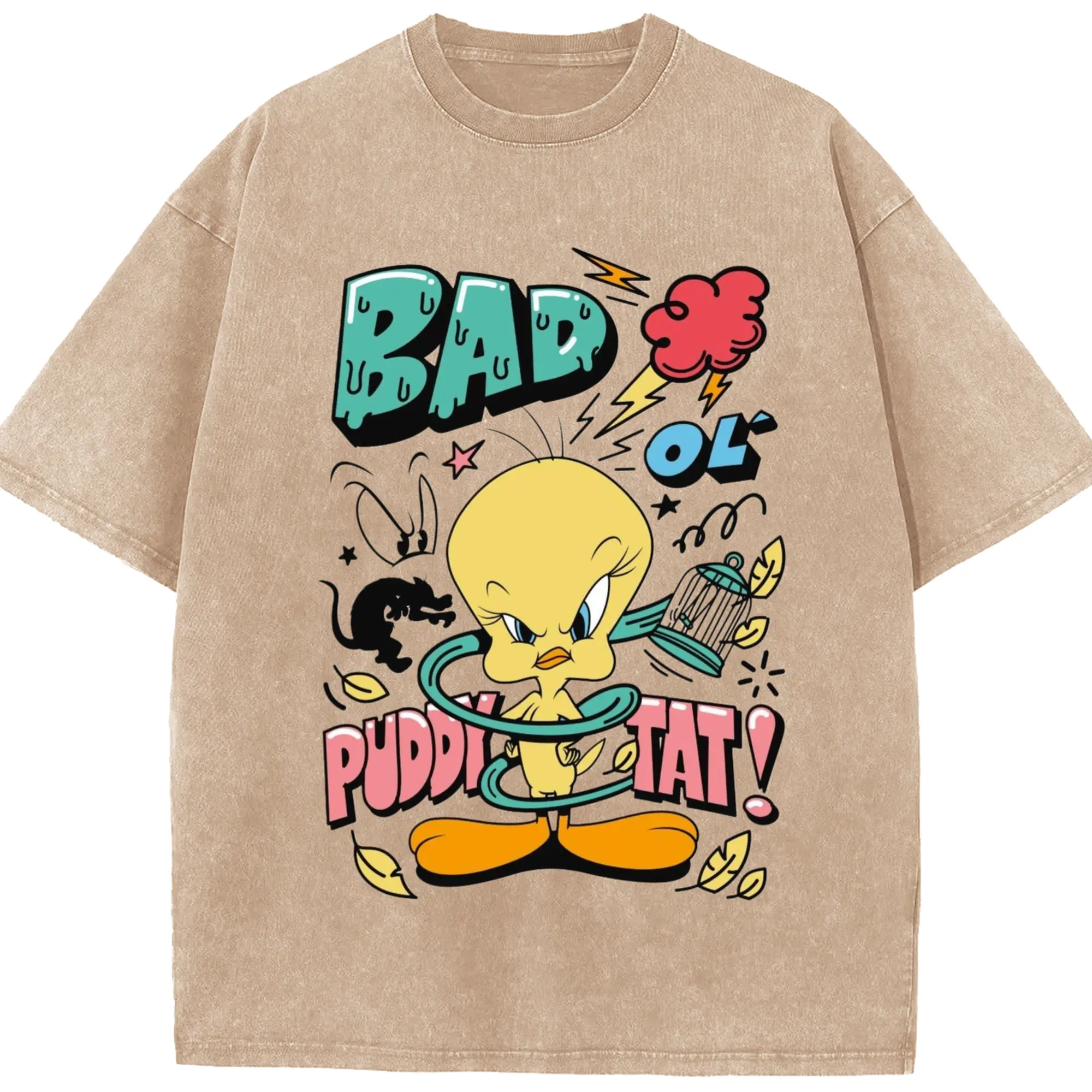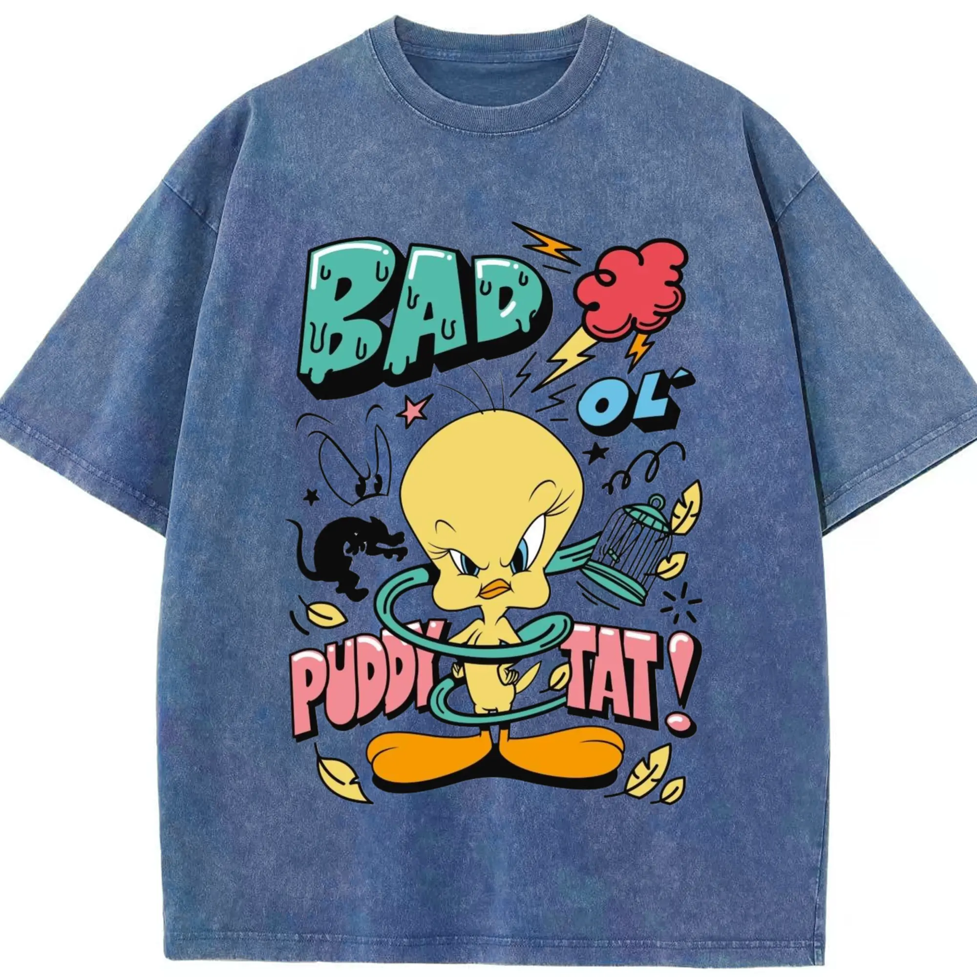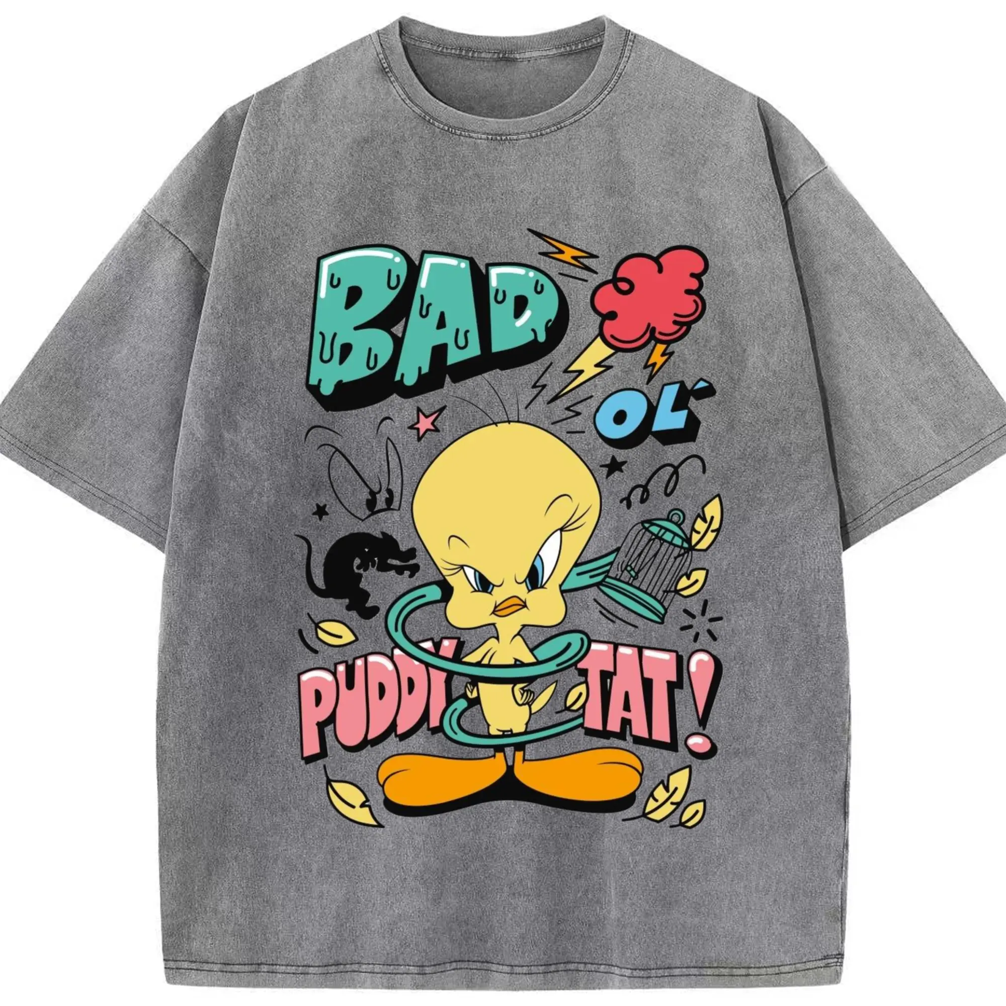 Tweety Bird cartoon graphic t-shirt - Washed Vintage Look 230g Cotton Oversized T-Shirt With Front Heat Transfer Print – Soft, Lightweight, Stylish Fit – Comfortable Casual Wear For Sports & Everyday Use