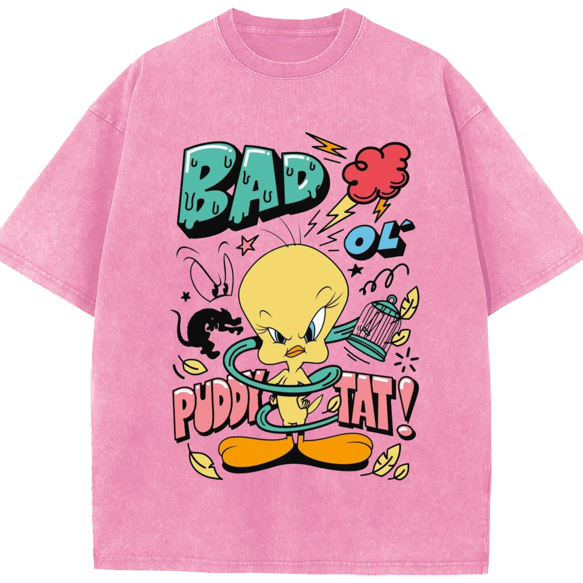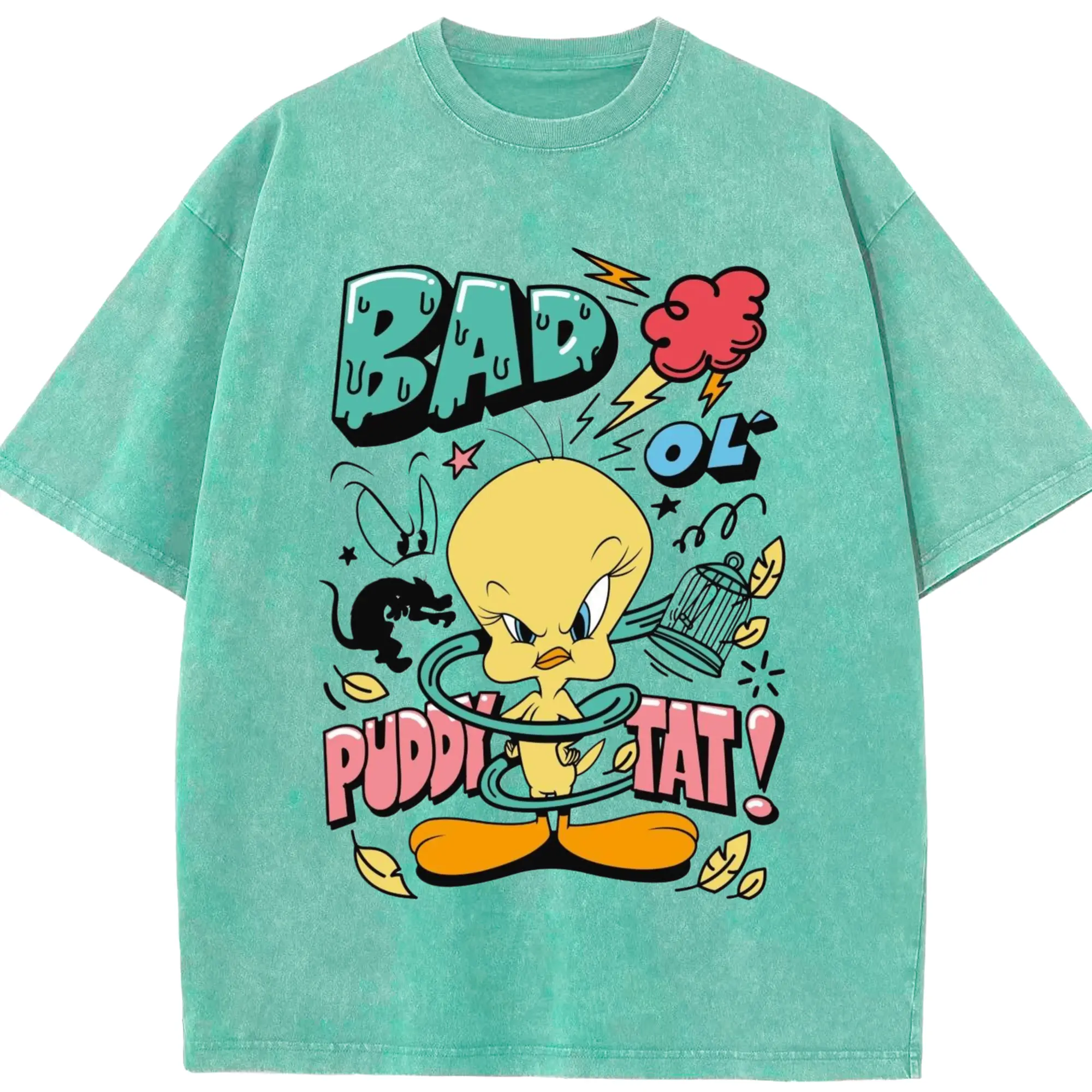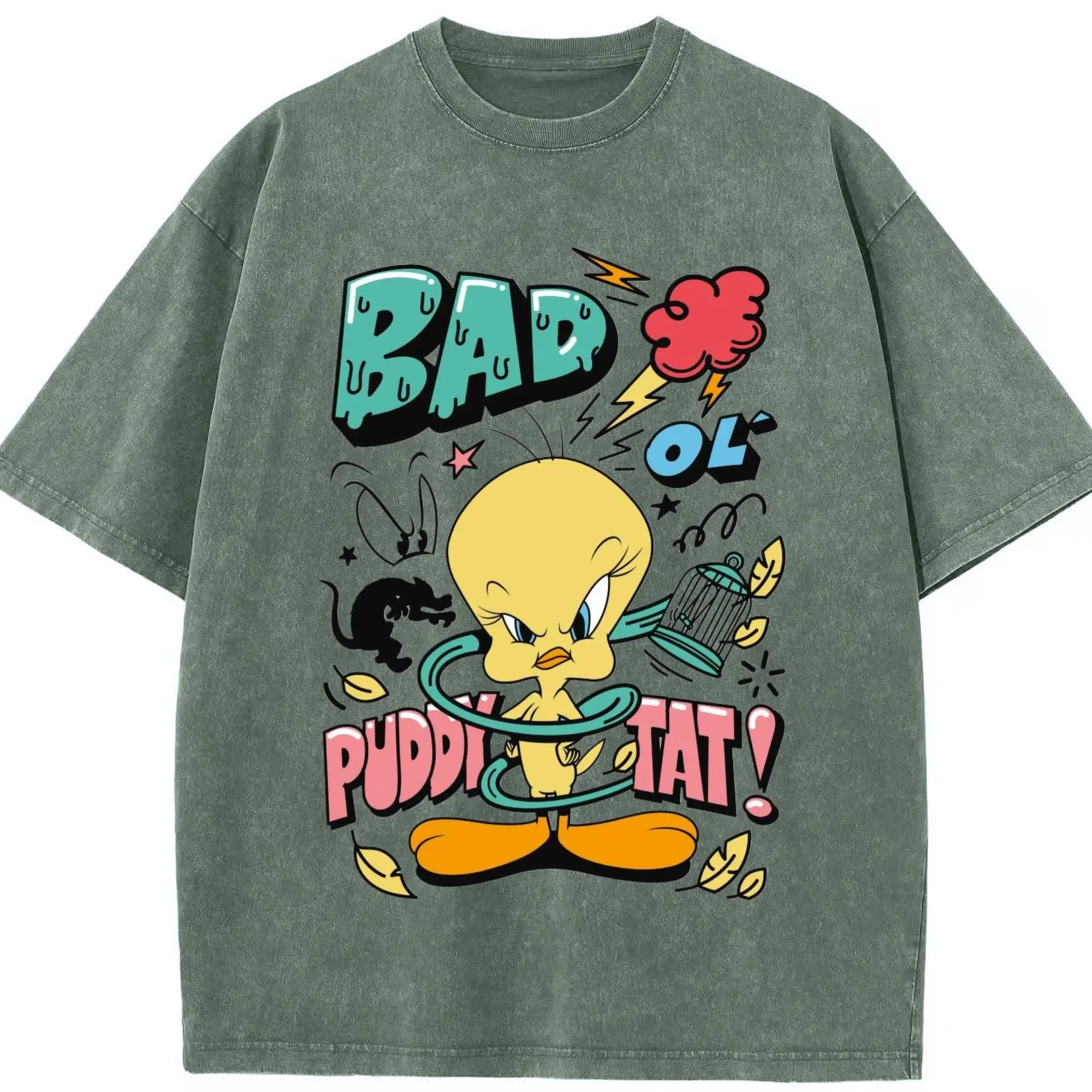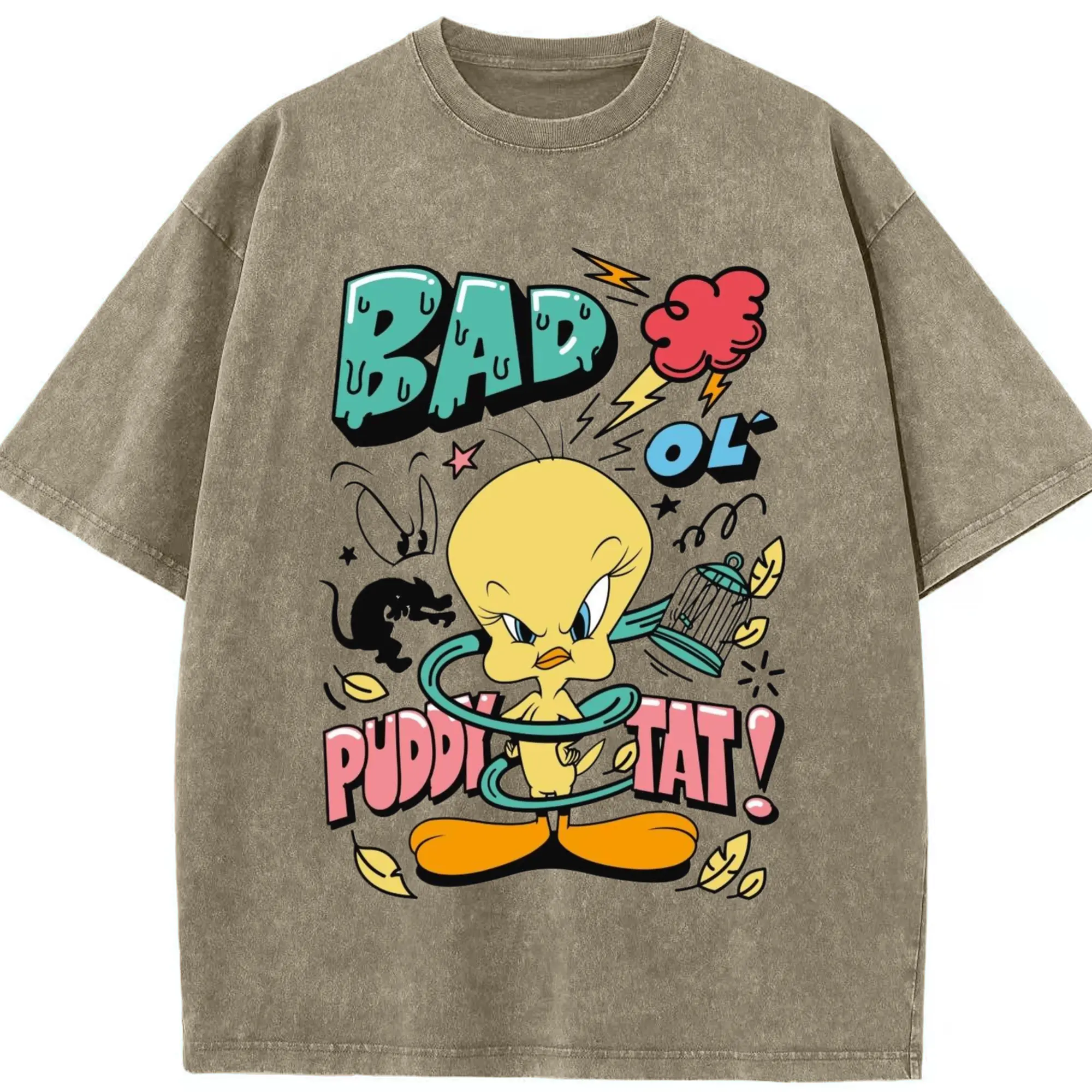 Tweety Bird cartoon graphic t-shirt - Washed Vintage Look 230g Cotton Oversized T-Shirt With Front Heat Transfer Print – Soft, Lightweight, Stylish Fit – Comfortable Casual Wear For Sports & Everyday Use